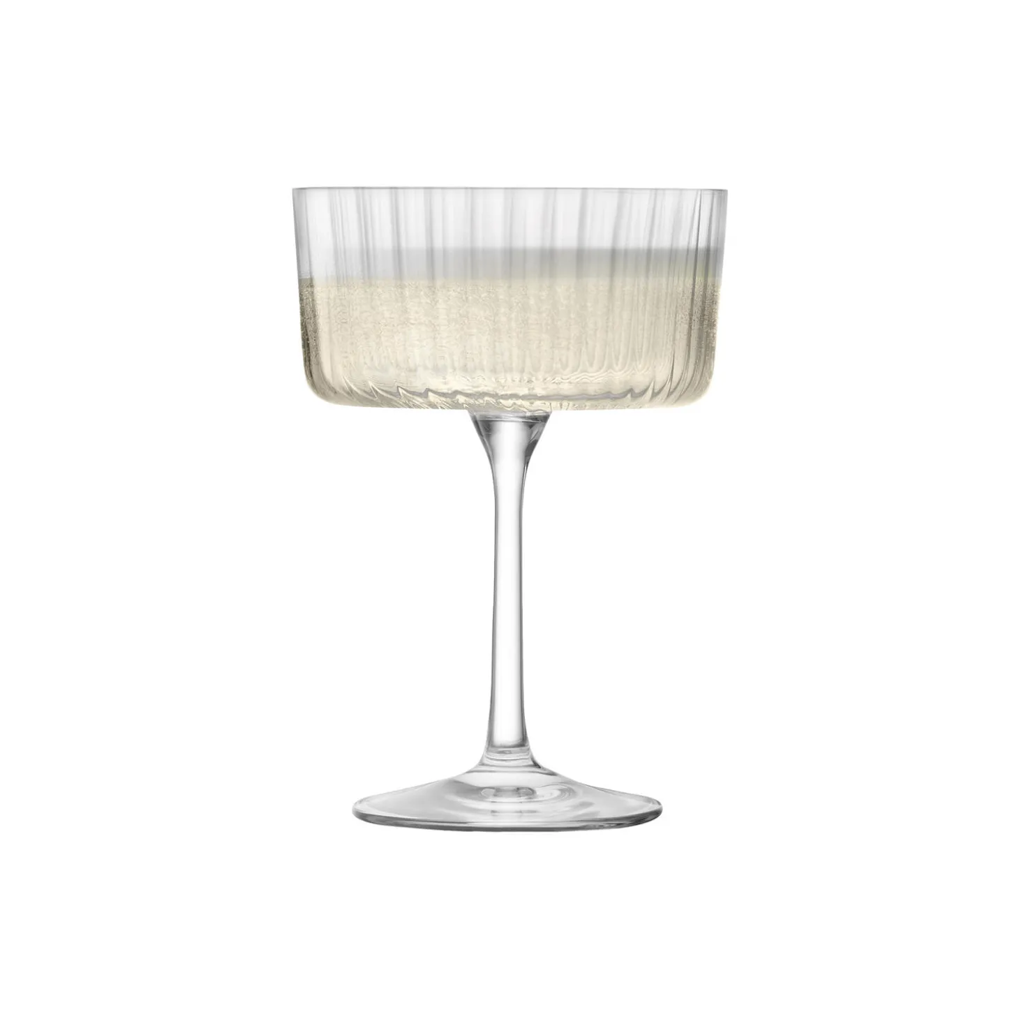 Et sæt af 4 stk. cocktail- eller champagneglas med rene linjer, bløde firkantede kanter og parrede bagsidesilhuetter. Den lineære, teksturerede finish fremhæver Gios rene, moderne design. Ideel til servering af cocktails, champagne eller prosecco.