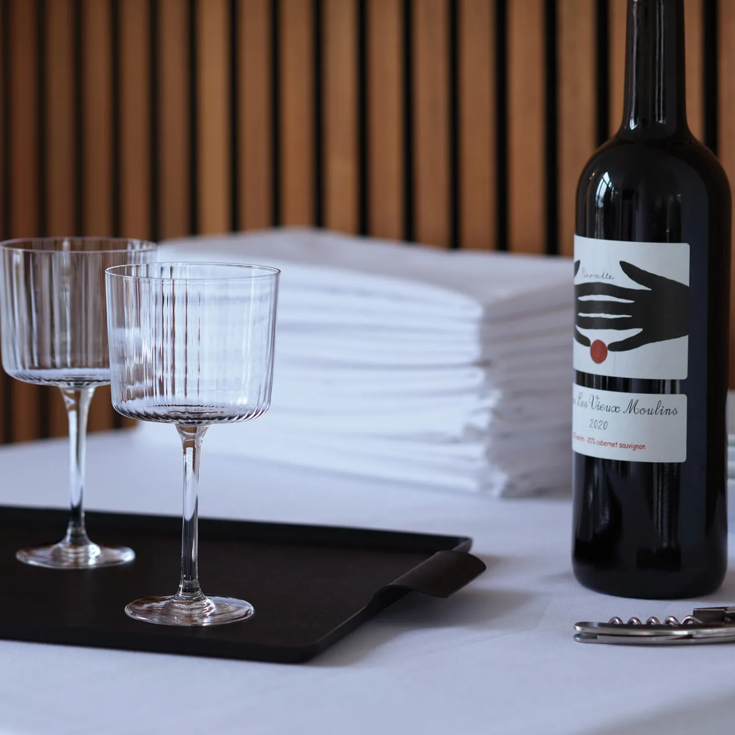 Et sæt af 4 stk. vinglas med rene linjer, bløde firkantede kanter og parrede bagsidesilhuetter. Den lineære, teksturerede finish fremhæver Gios rene, moderne design, og ideel til både rød, hvis og rosé.