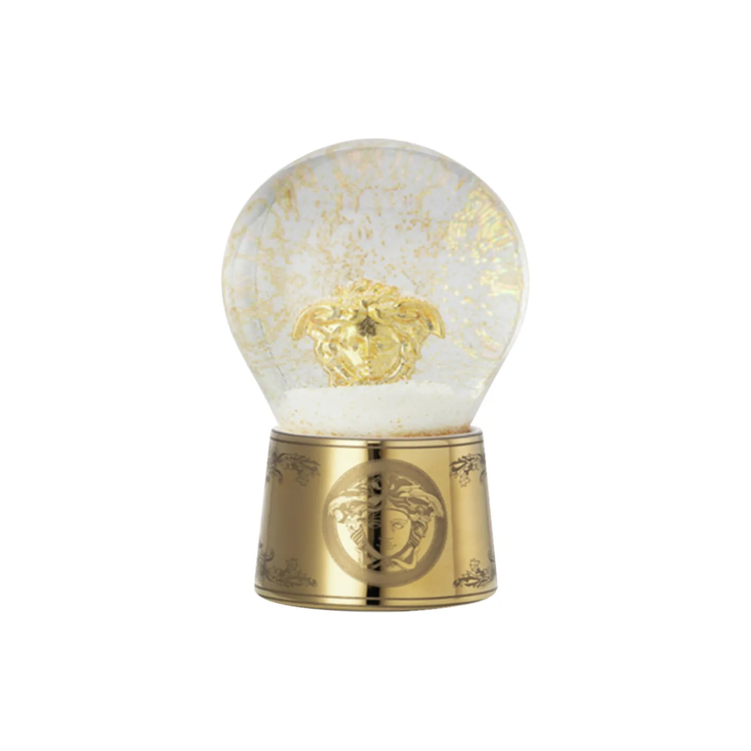 A sophisticated gift idea, this snow globe features a three-dimensional Medusa placed inside a snow-effect glass sphere. Crafted from exceptional porcelain, the gold-tone base boast a matte motif of the mythical woman framed with a Barocco border.
