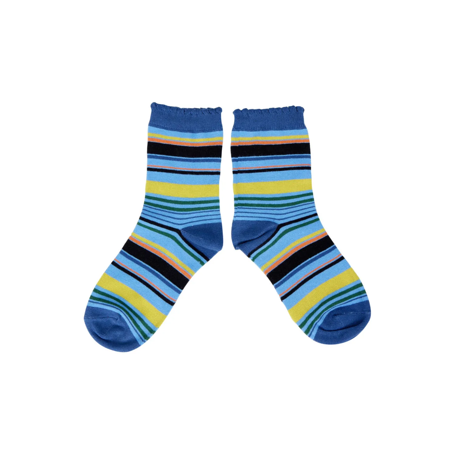 Strømper i en blød og komfortabel bomuldskvalitet med multifarvede asymmetriske striber. Økotex certifticeret.