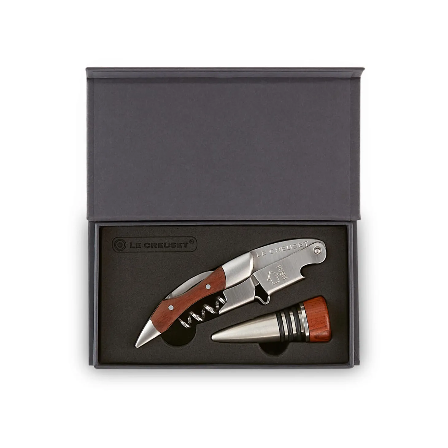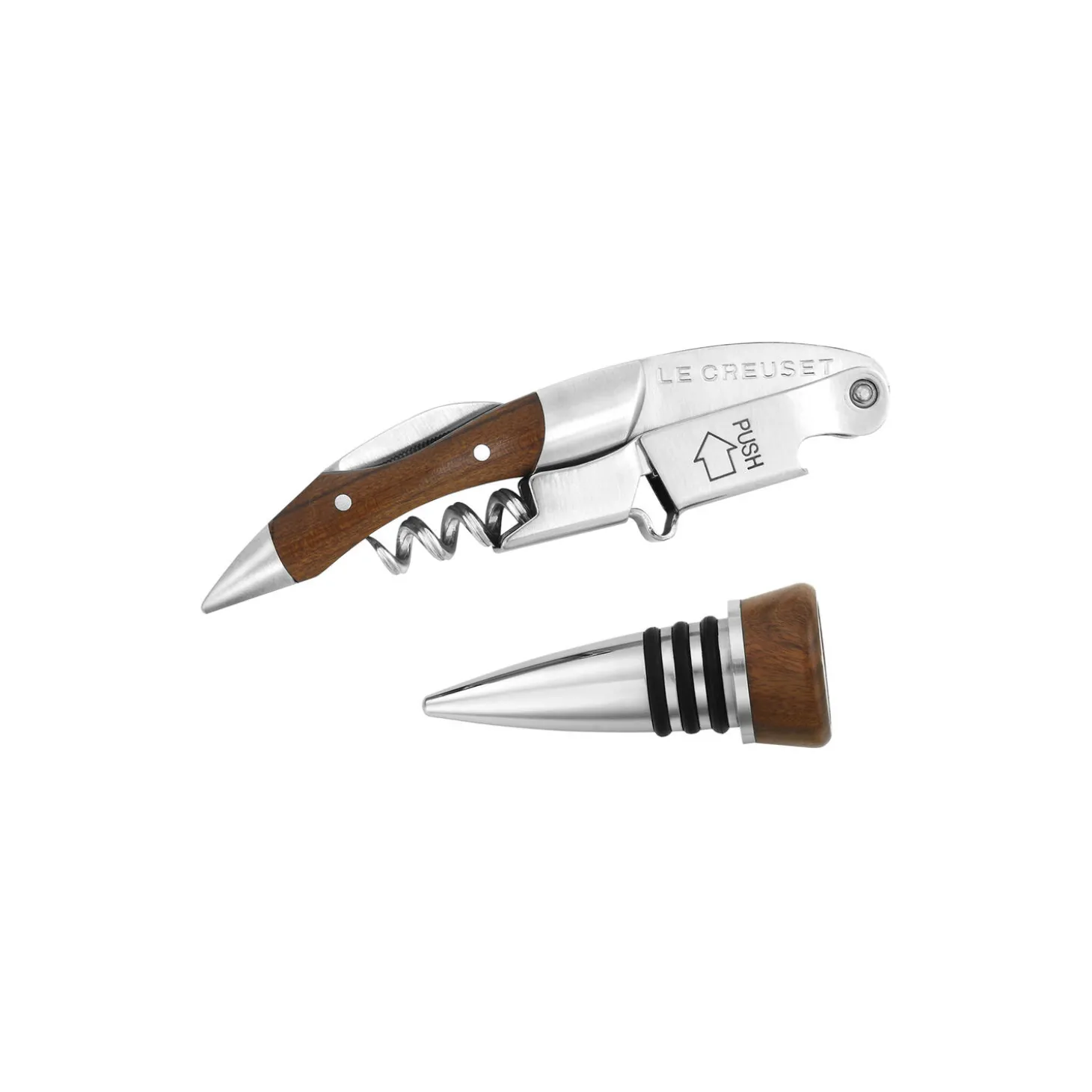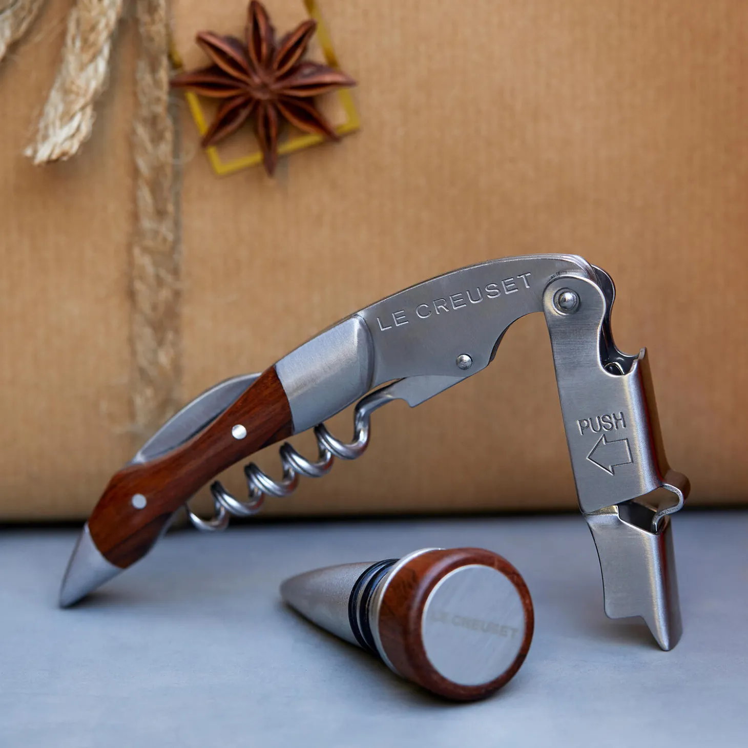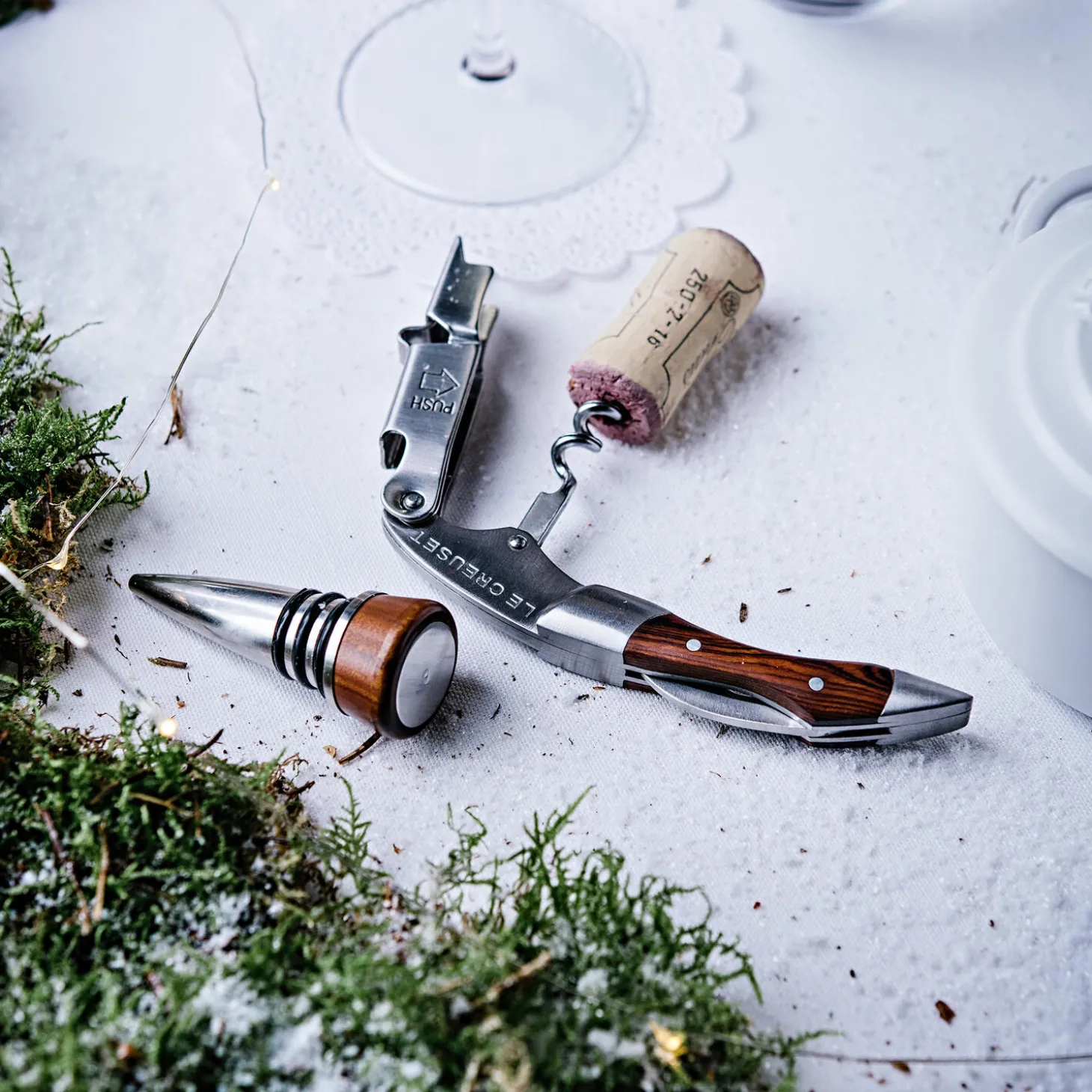 Denne smarte duo er praktisk og smuk – den perfekte gave til vinelskeren i dit liv. Åbn æsken og du vil finde en nøje fremstillet proptrækker og prop i rosentræ. Proptrækkerens to-trinssystem gør den nem at bruge, og med den lille kniv kan du fjerne folien med et snuptag.