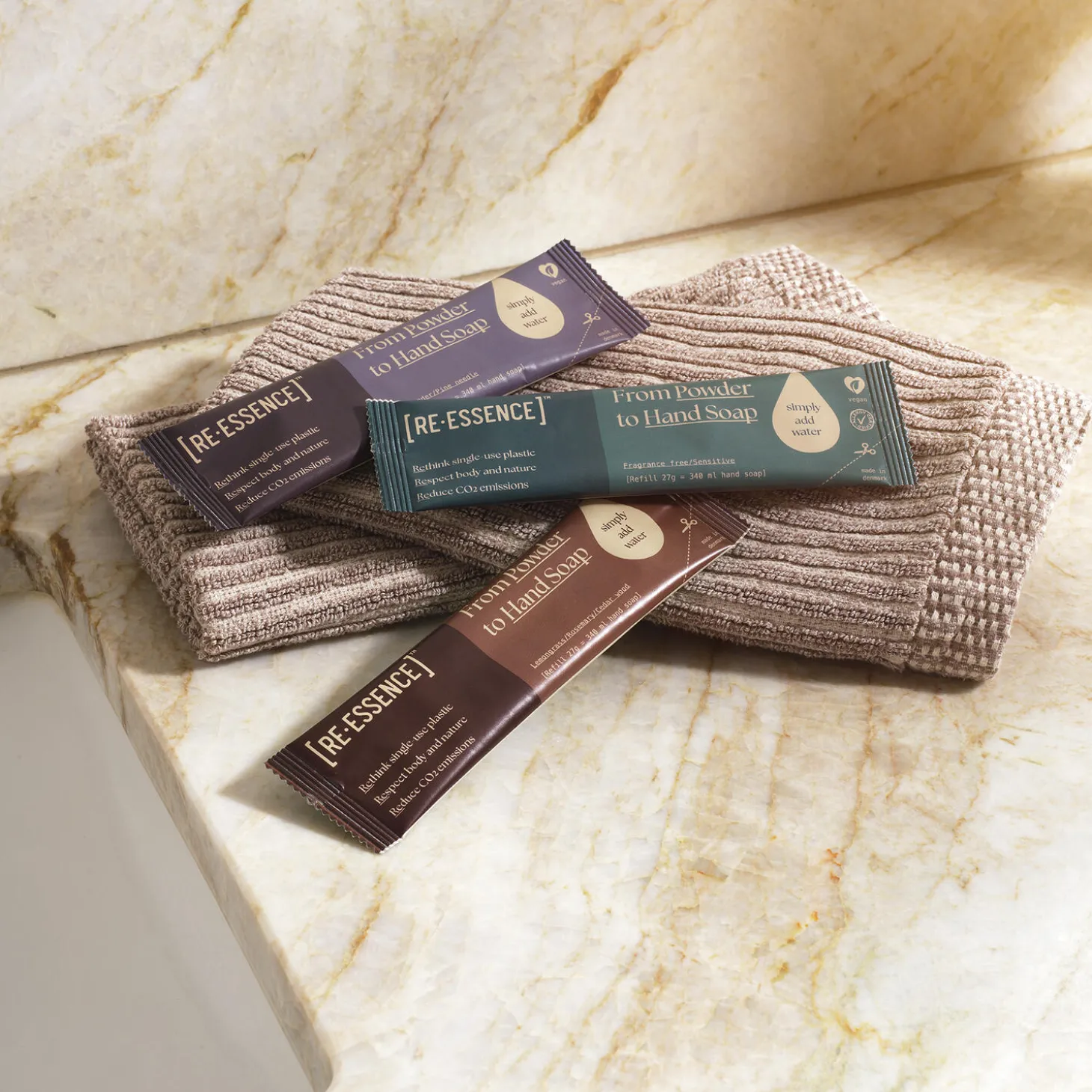 SÅDAN GØR DU: Fyld den genanvendelige flaske med 310 ml lunkent vand fra hanen. Der er en streg-markering på bagsiden af [RE·ESSENCE]™ flasken. Tilsæt pulver, sæt pumpen i og vend flasken forsigtigt op og ned i 30 sek. Pulveret kan klumpe, men vil blive opløst helt. Brug den medfølgende tragt i starter sættet for at undgå spild. Lad blandingen stå natten over mens pulveret opløses. Vend flasken op og ned et par gange næste morgen. Et refill sæt giver 3 x 340 ml nærende og fugtgivende håndsæbe af 98% naturlig oprindelse.