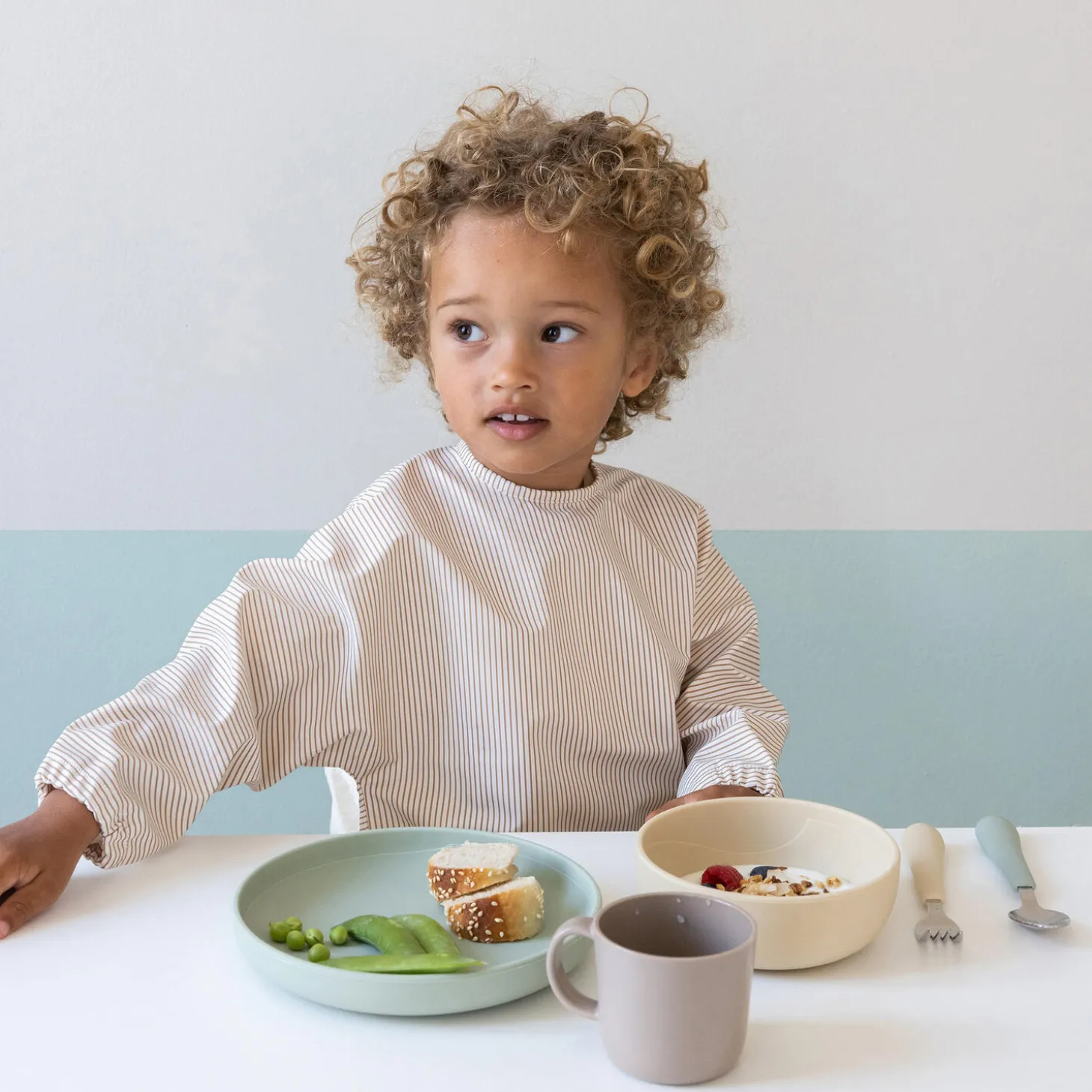 Heldækkende Hagesmæk med lange ærmer og en praktisk lomme. Perfekt både til måltider og kunstnerisk udfoldelse, så du ikke behøver at skifte tøj eller bekymre dig om pletter og stænk.