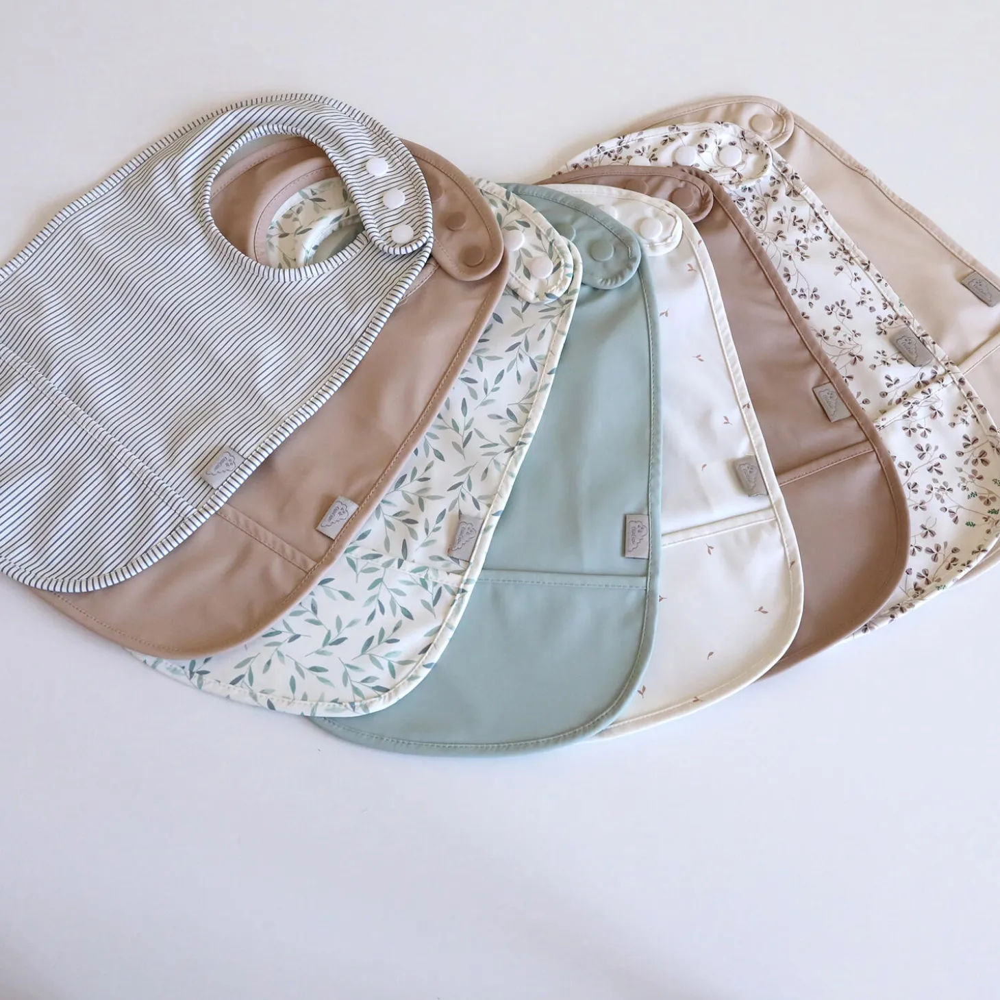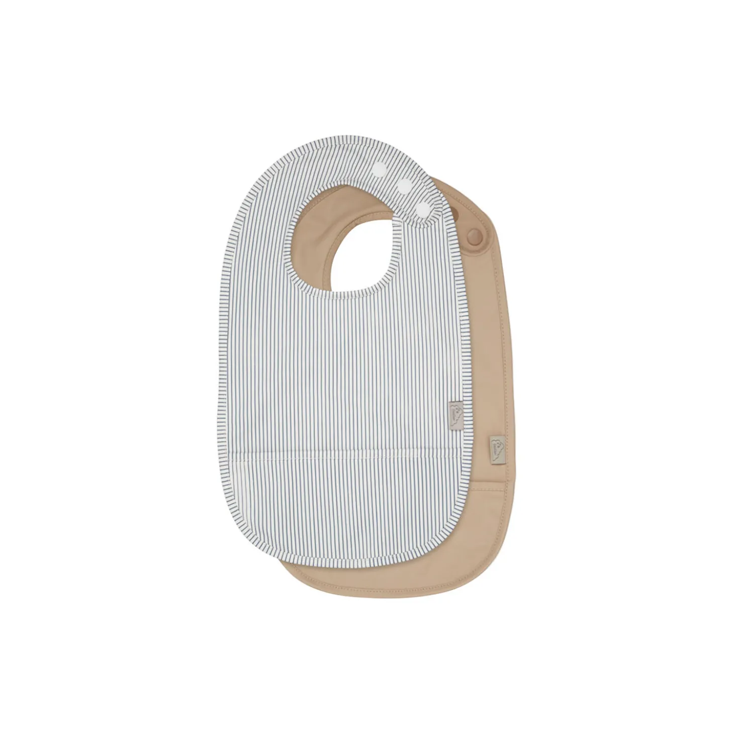Sæt med to pæne og praktiske hagesmække, der nemt kan tørres af og er designet med en lomme foran til at fange mad på afveje. Hagesmækkene er fremstillet i genanvendt polyester. Et hverdags-must-have til de mange potentielt plettende måltider. Kommer i et sæt med en printet og en ensfarvet hagesmæk i matchende farvetoner.