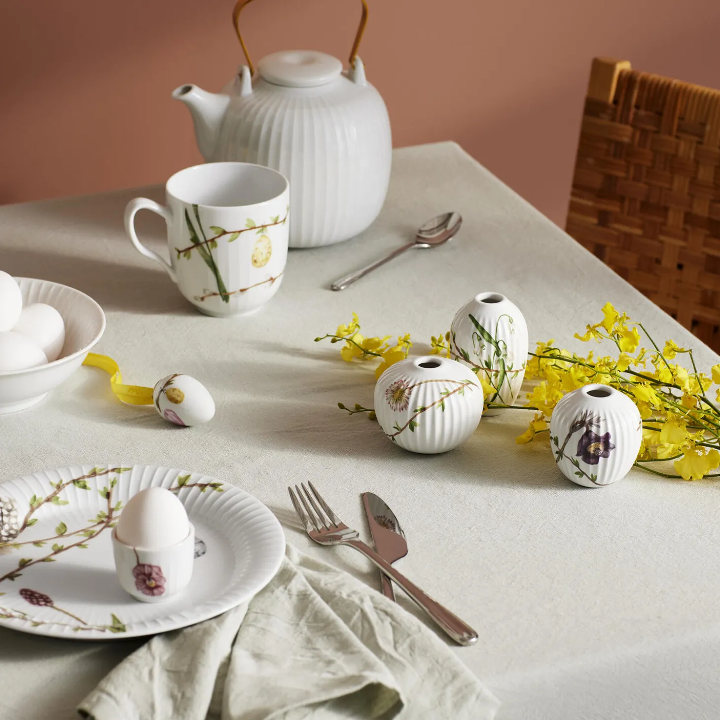 Påske går ofte hånd i hånd med de første forårsfornemmelser – og den stemning er på smukkeste vis indfanget i Hammershøi Easter. Den eventyrligt smukke påskekollektion er dekoreret med nyudsprungne grene og traditionsrige påskesymboler, der er håndmalet af Rikke Jacobsen og overført til porcelænet. Miks påske-stellet med Hammershøis klassiske hvide stel og skab et moderne påskebord med enkle virkemidler. Tåler maskinopvask. Hammershøi Easter-kollektionen indeholder også en tallerken, en bonbonniere og påskeophæng. Hammershøi Easter-kruset har 2 års brudgaranti.