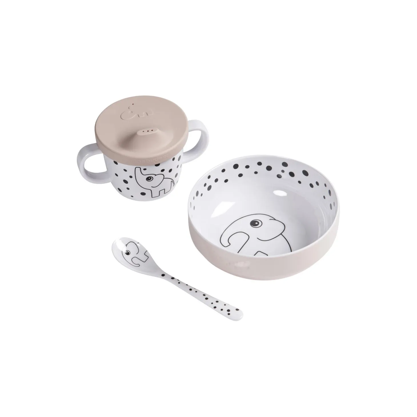 Happy Dots mit første spisesæt i 100% melamin og låg i 100% silikone fra Done By Deer. Farve: pudder. Mål: H: 5 x Ø 13,5 / H: 6,5 x Ø 8 / L: 14 cm. Design: Done By Deer.