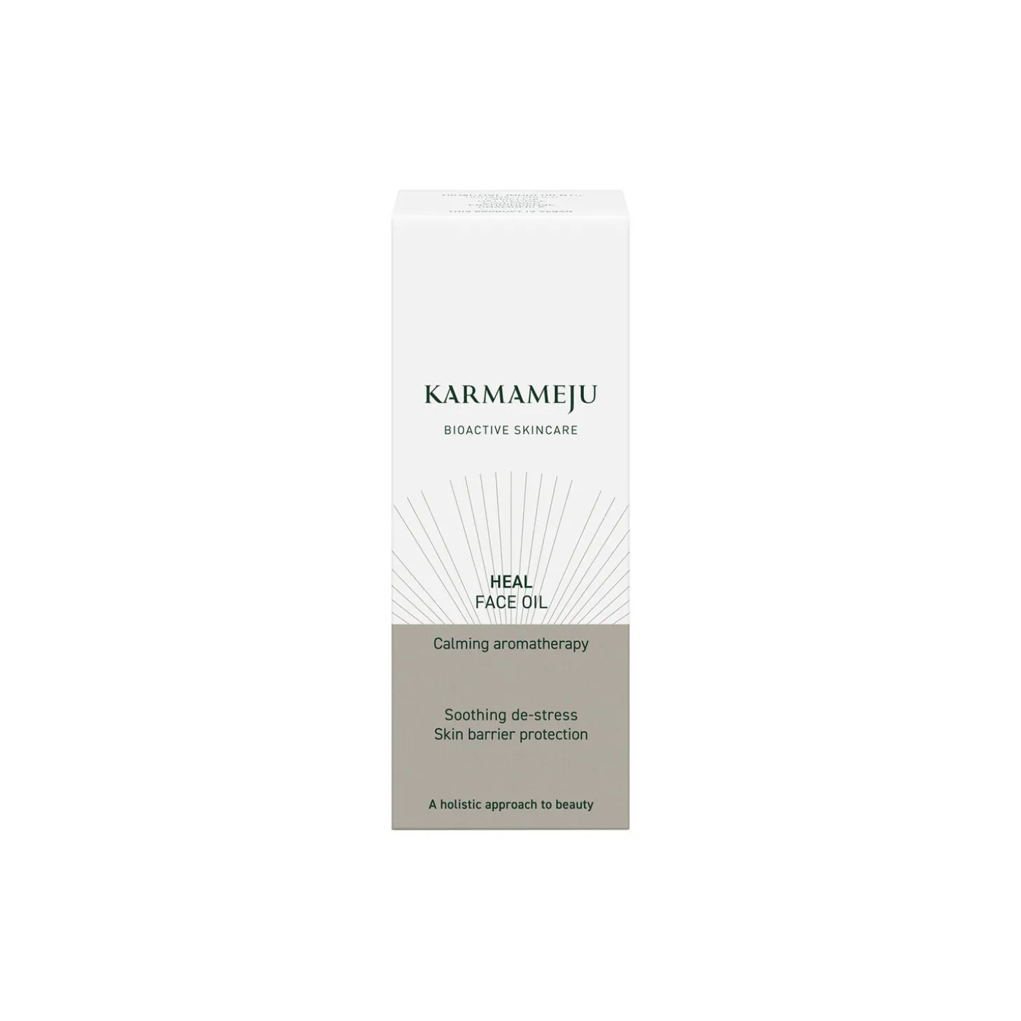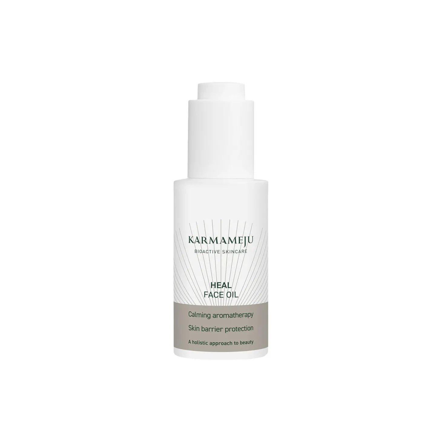 Heal Face Oil 02 til følsom/irriteret hud med olier fra havrekerne, mandel, camellia og havtorn samt ingefærekstrakt og æteriske olier fra økologisk lavendel, kamille, rose og sandeltræ fra Karmameju. Indeholder 40 ml.