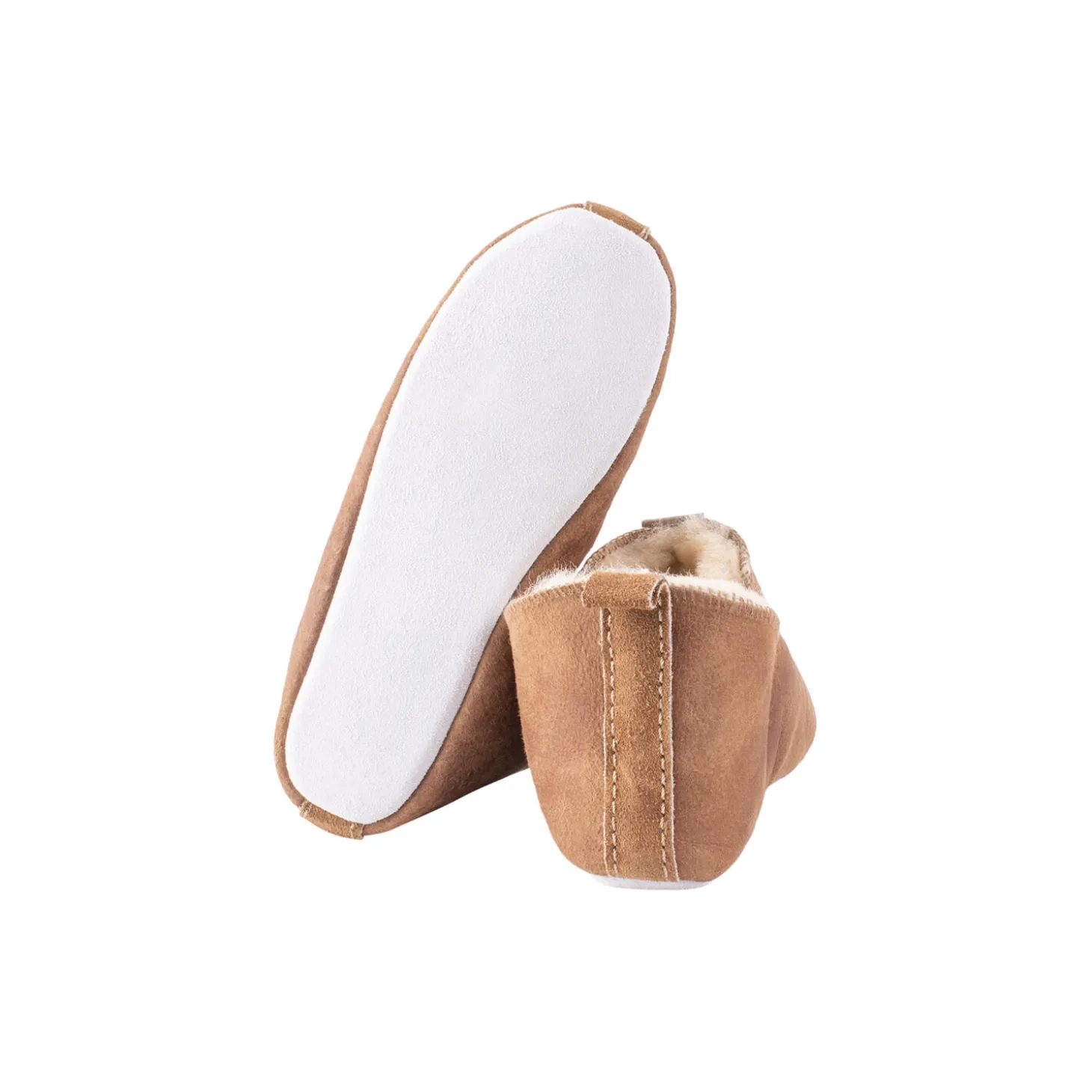 Henrik tøfler i 100% fåreskind med sål i ruskind fra Shepherd of Sweden. Farve: antique cognac.