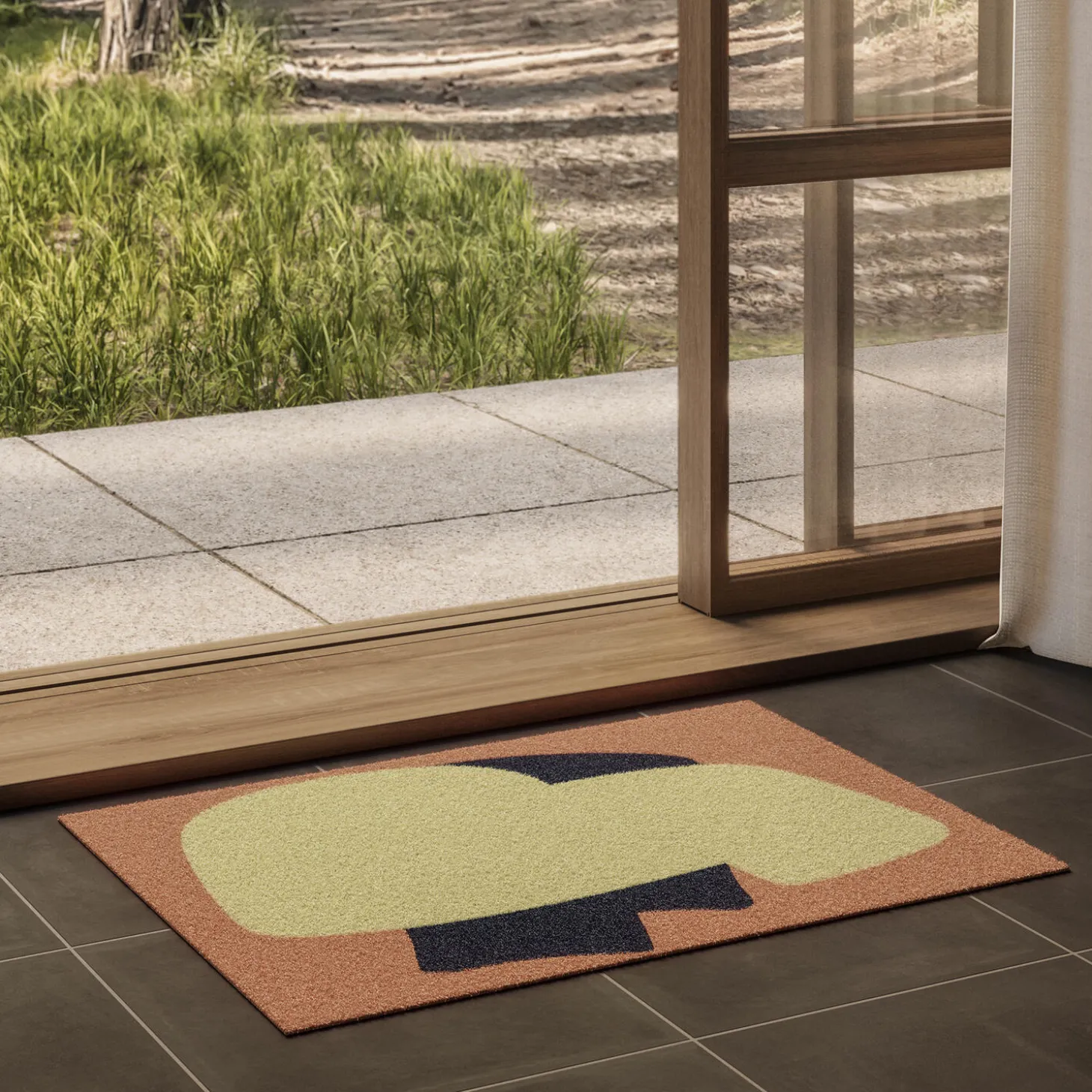 The design is inspired by iconic furniture forms that elegantly merge into a new, organic shape. The carpet features a harmonious color combination of emerald green and dark indigo, exuding a sophisticated elegance. This gives the entrance area a premium expression and complements a well-thought-out interior.