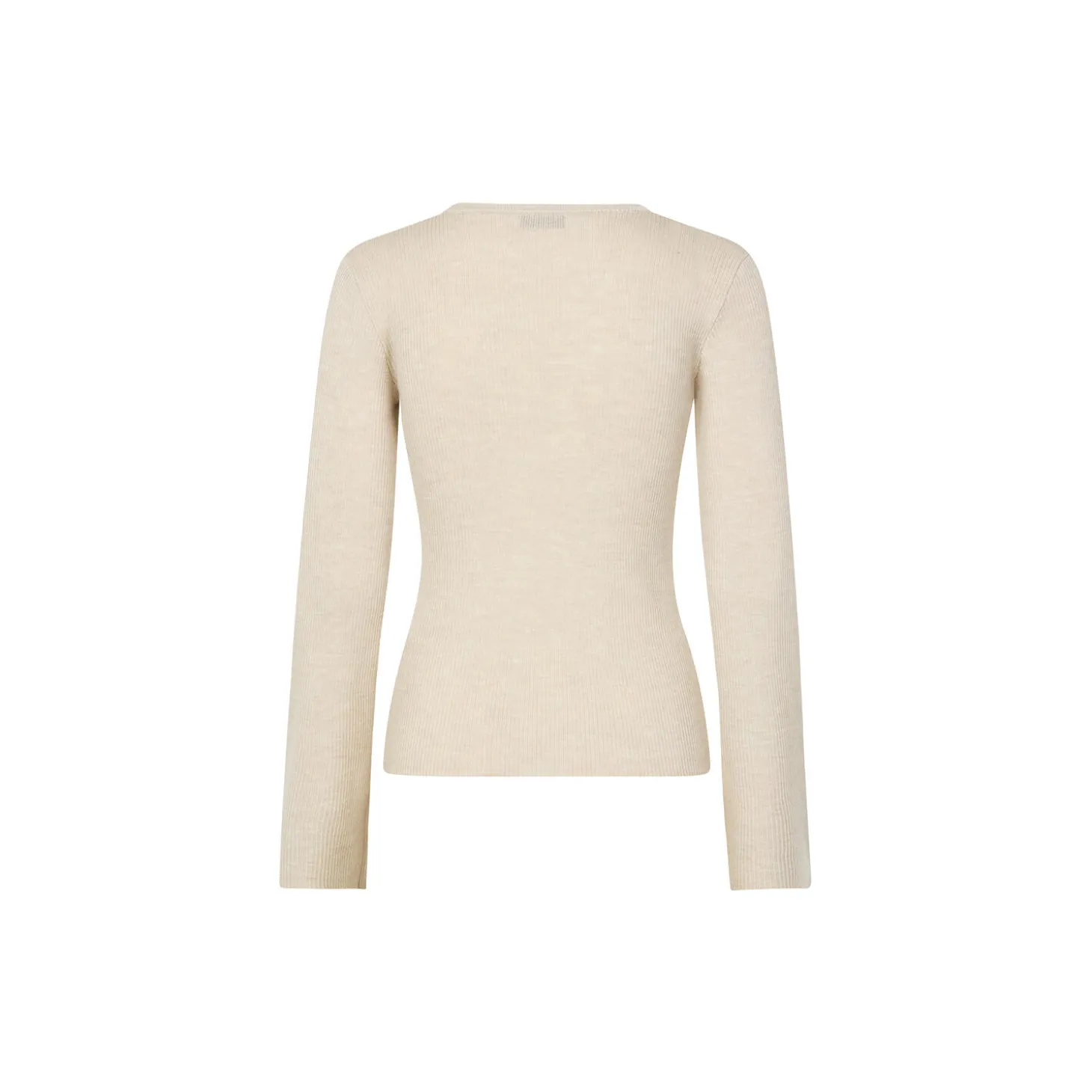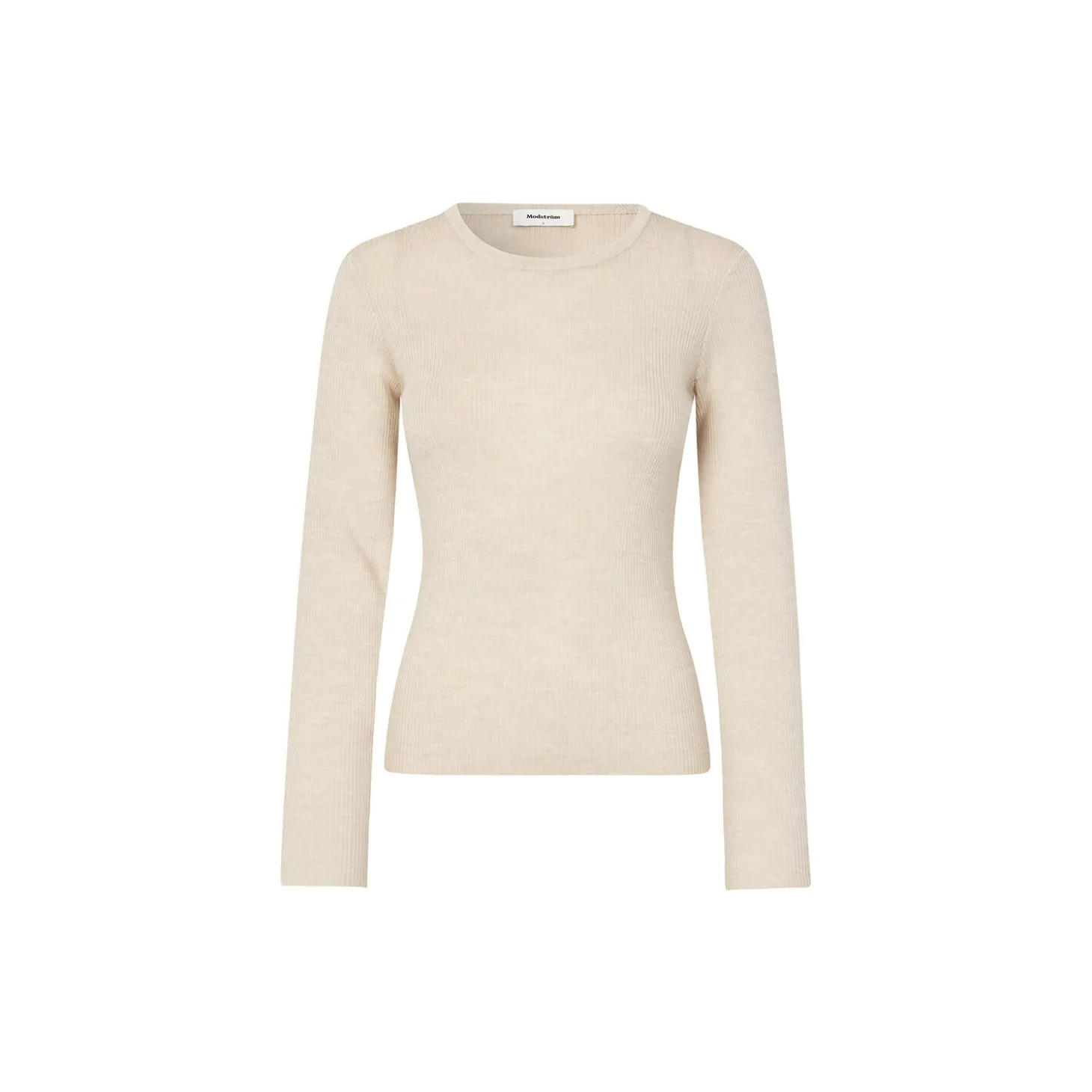 Tætsiddende top i blød ribstrik af uld. HirokiMD o-neck lange brede ærmer. Modellen er 175 cm og har en størrelse S/36 på.