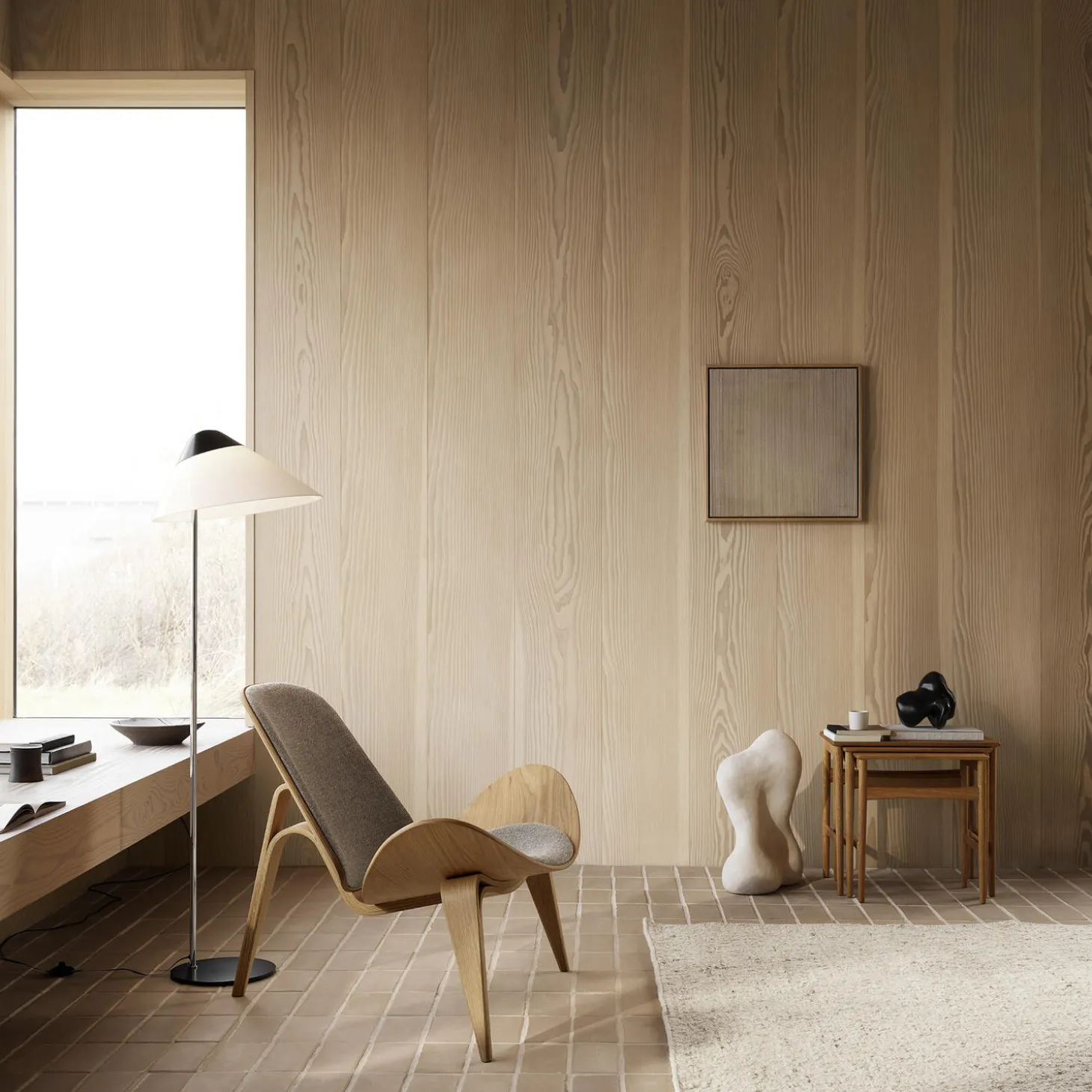 HJW03 Opala Gulvlampe Midi er designet af Hans J. Wegner i 1973 som en del af en større lysserie designet til Hotel Scandinavia i København. Serien præsenterer et markant, nærmest futuristisk udtryk med let skråtstillede lampeskærme og lige linjer. Opala gulvlampe har en asymmetrisk opal akrylskærm med en malet aluminiumtop, der udstråler et behageligt, fokuseret lys, mens den blødt oplyser det omgivende rum gennem lampeskærmen. Velegnet til stue og lounge omgivelser.