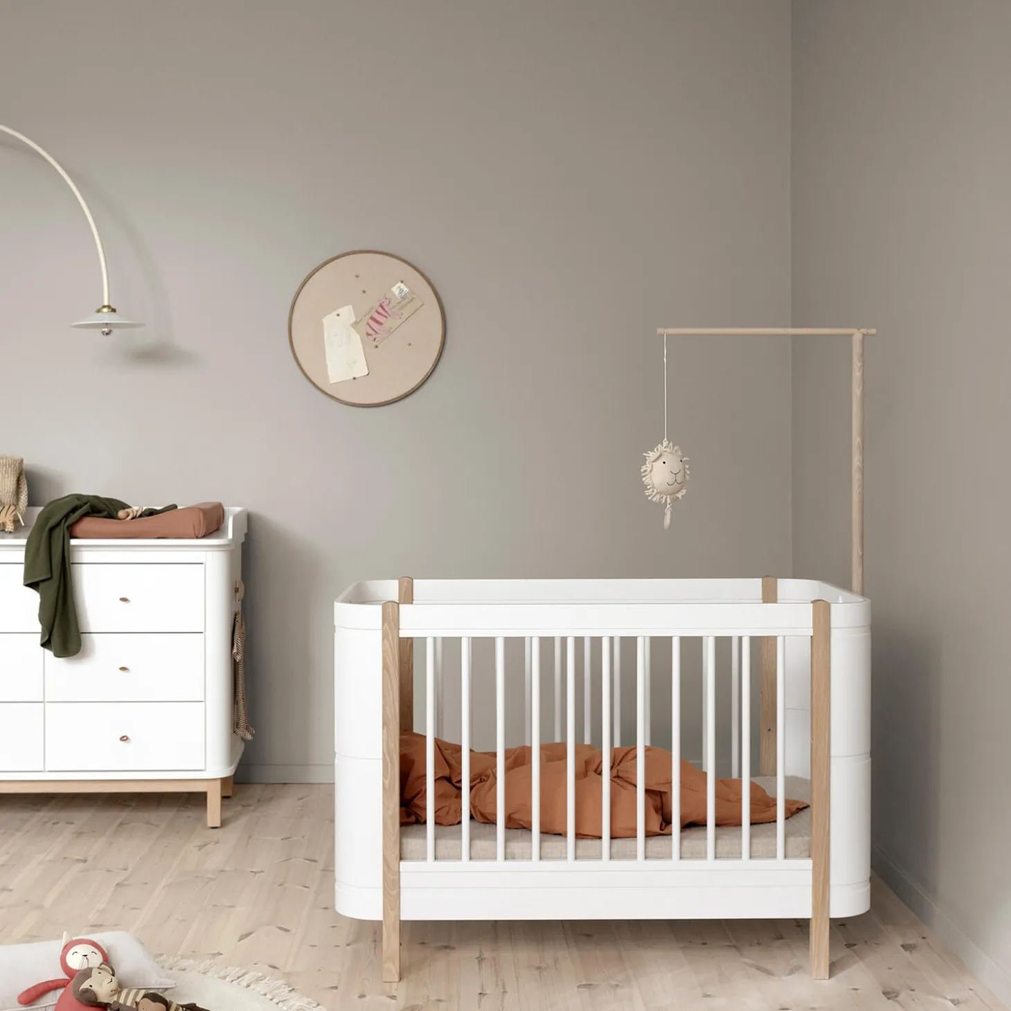 Holderen, der nemt monteres på sengen, fungerer som oplagt base for en fin uro, der kan stimulere babys blik. Holderen kan også anvendes til Mini+ sengehimmel, der udover at skabe tryghed for baby, skærmer for både træk og skarpt lys.Holderen til sengehimmel & uro er fremstillet i massivt træ og tilbydes i to forskellige modeller: hvid-olieret eg og hvid lakeret birk.De ikke-synlige skruer giver et rent og eksklusivt design og er særligt kendetegnende for Oliver Furniture.Holderen er produceret i Europa og overholder de strenge EU-krav for sikkerhed og sundhed. Holderen er behandlet med ikke-giftig, vandbaseret maling og olie til hvid-olieringen.