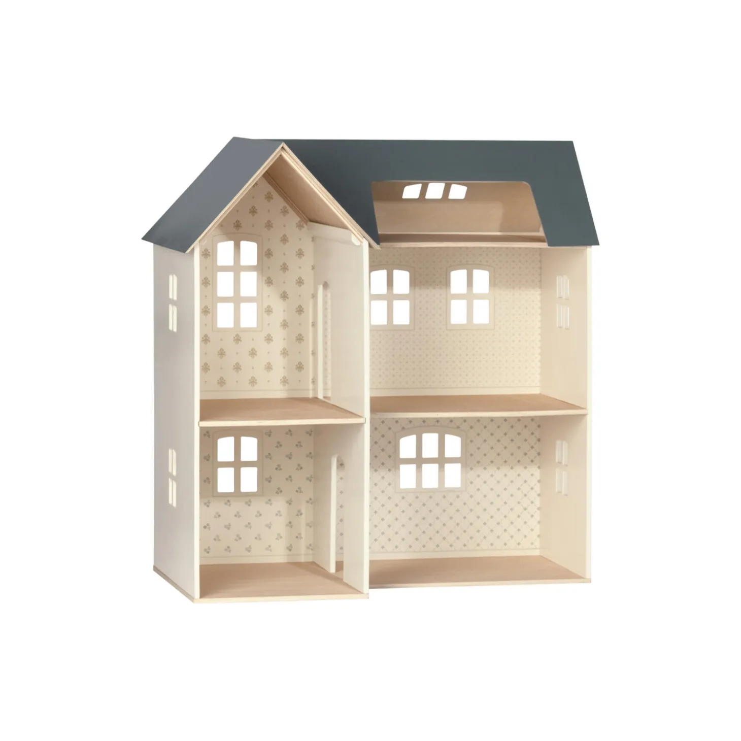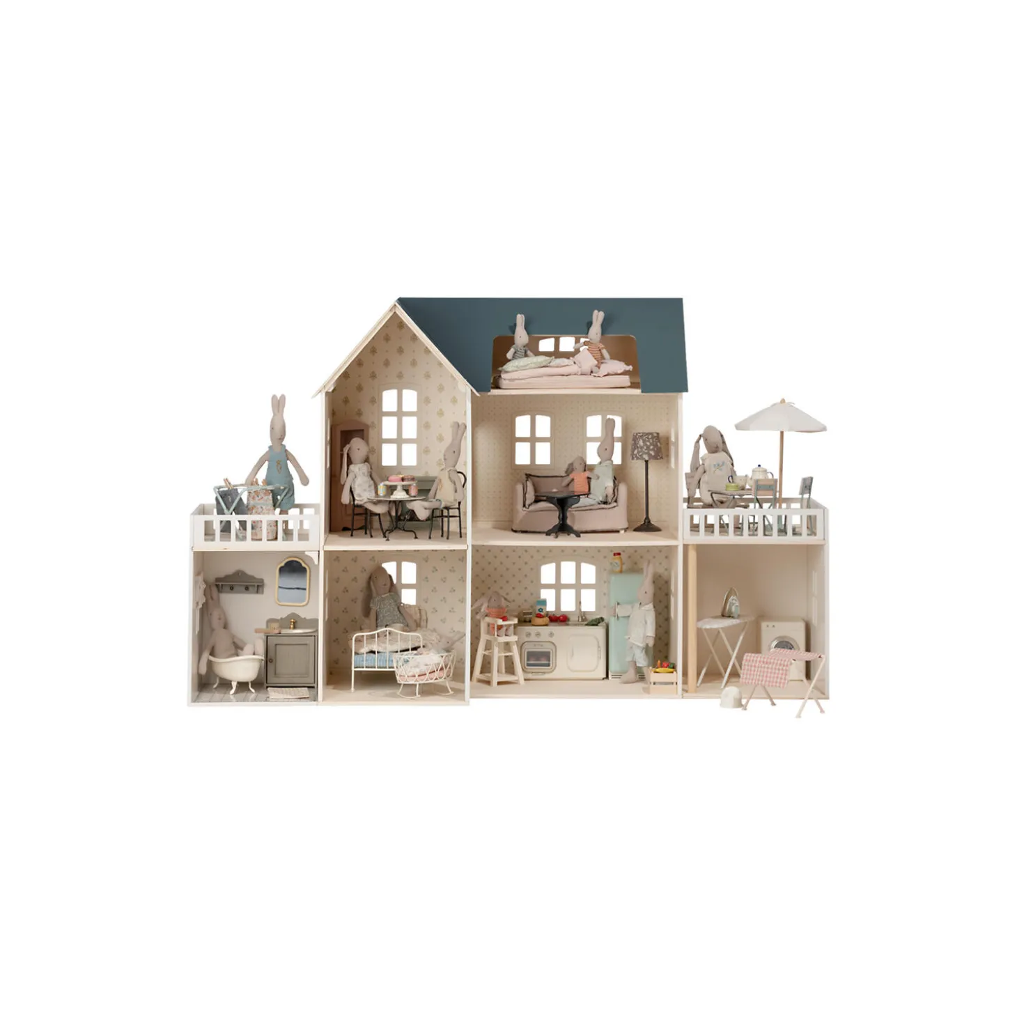 Maileg dukkehuset med flotte dekorerede vægge. Produkter som passer i huset: Kaniner i størrelse 1, 2, mikro og my, Teddy familien samt møbler og tilbehør fra Miniature serien.