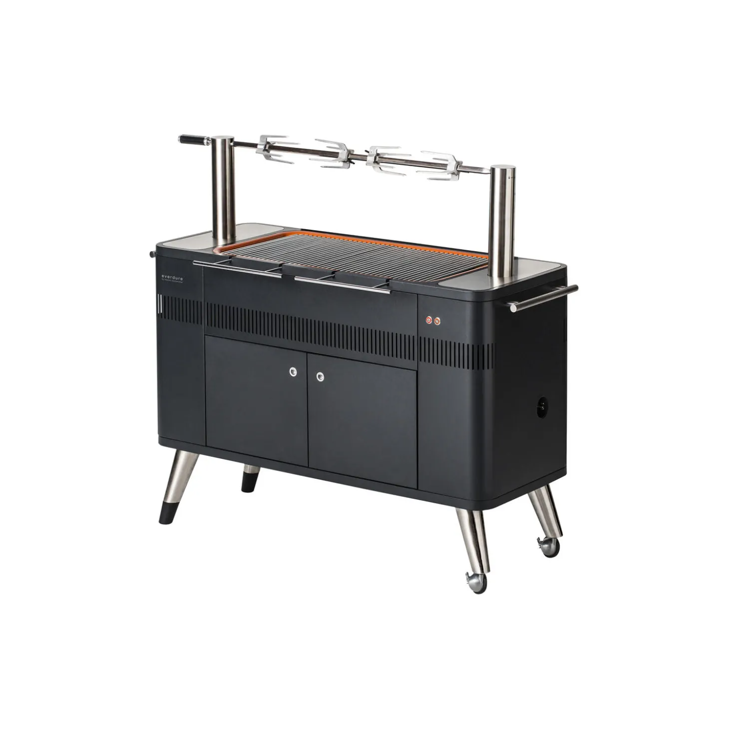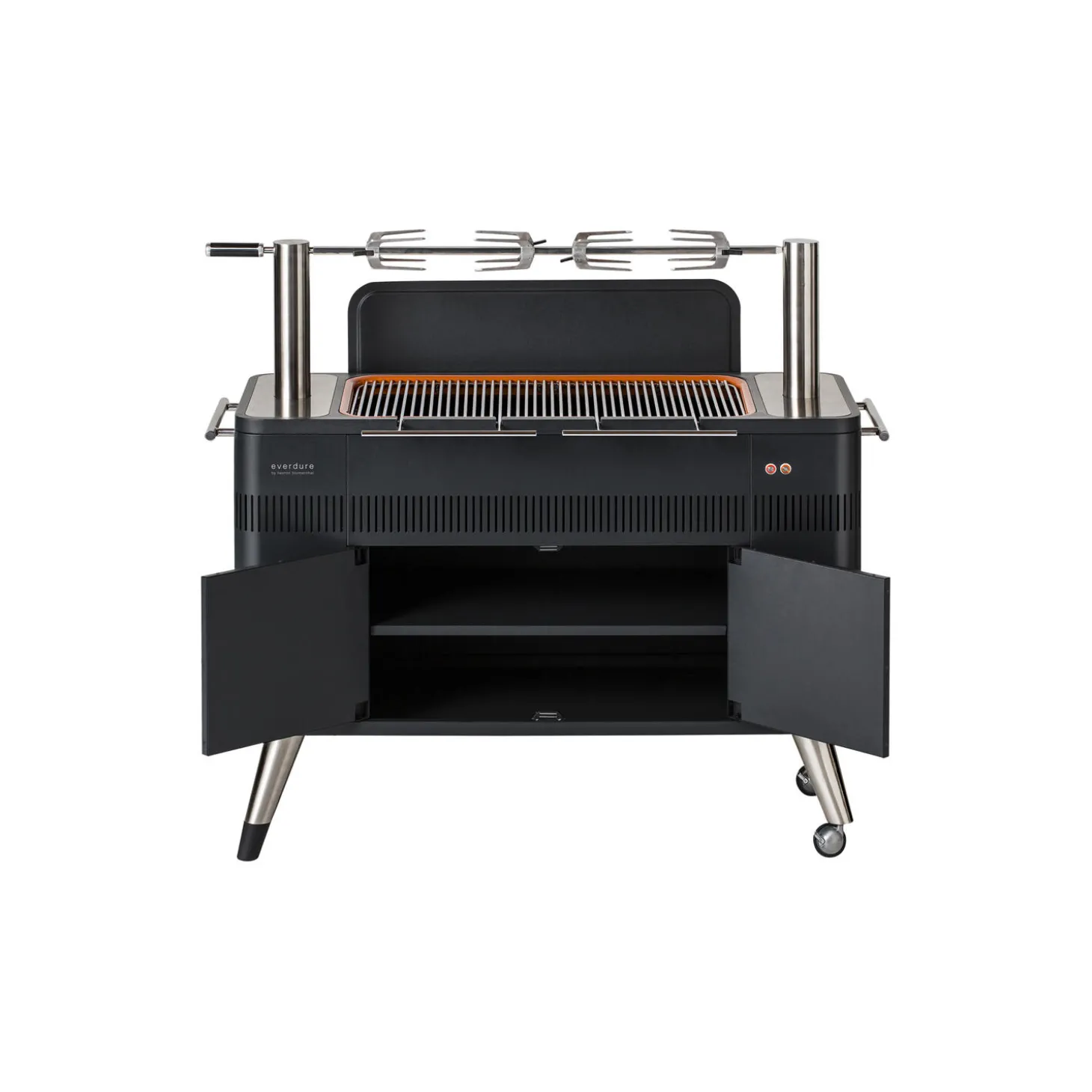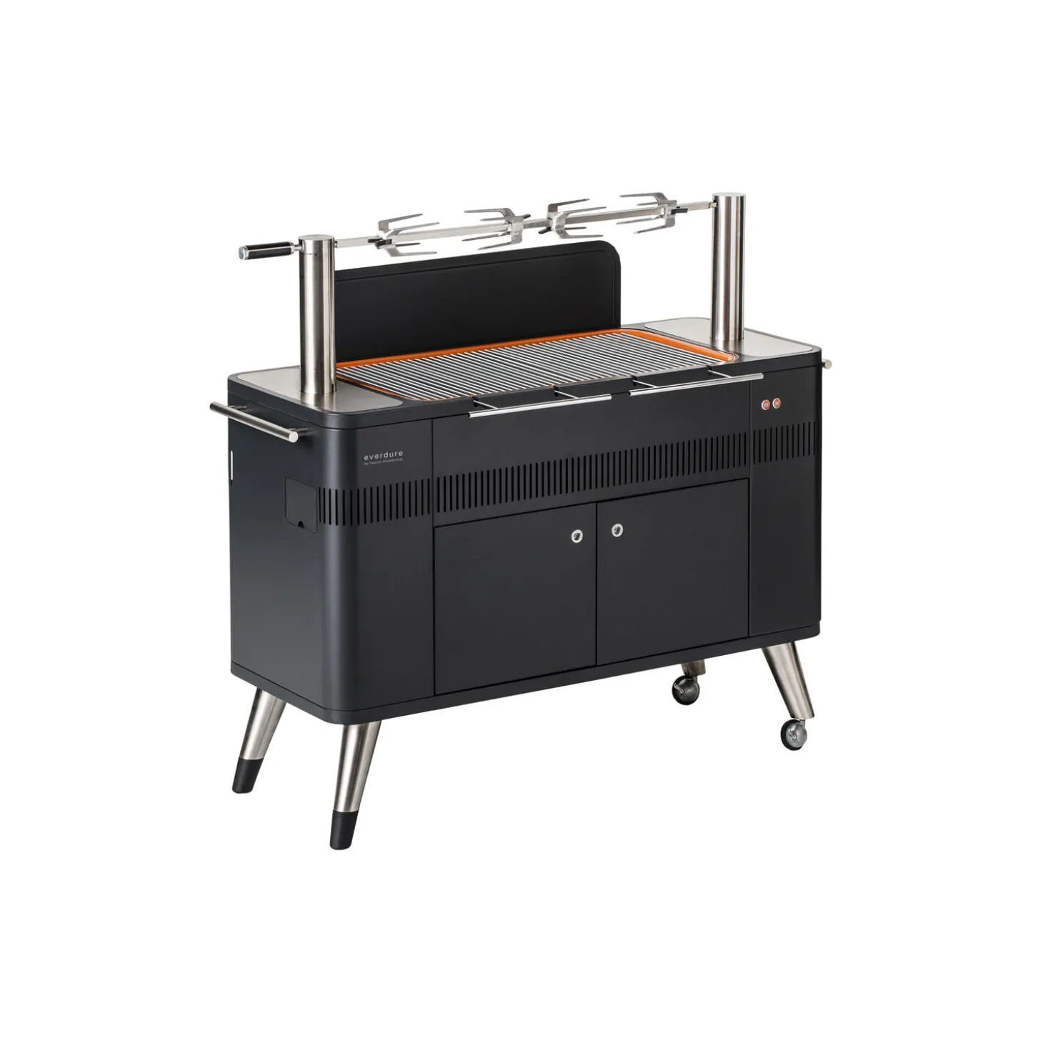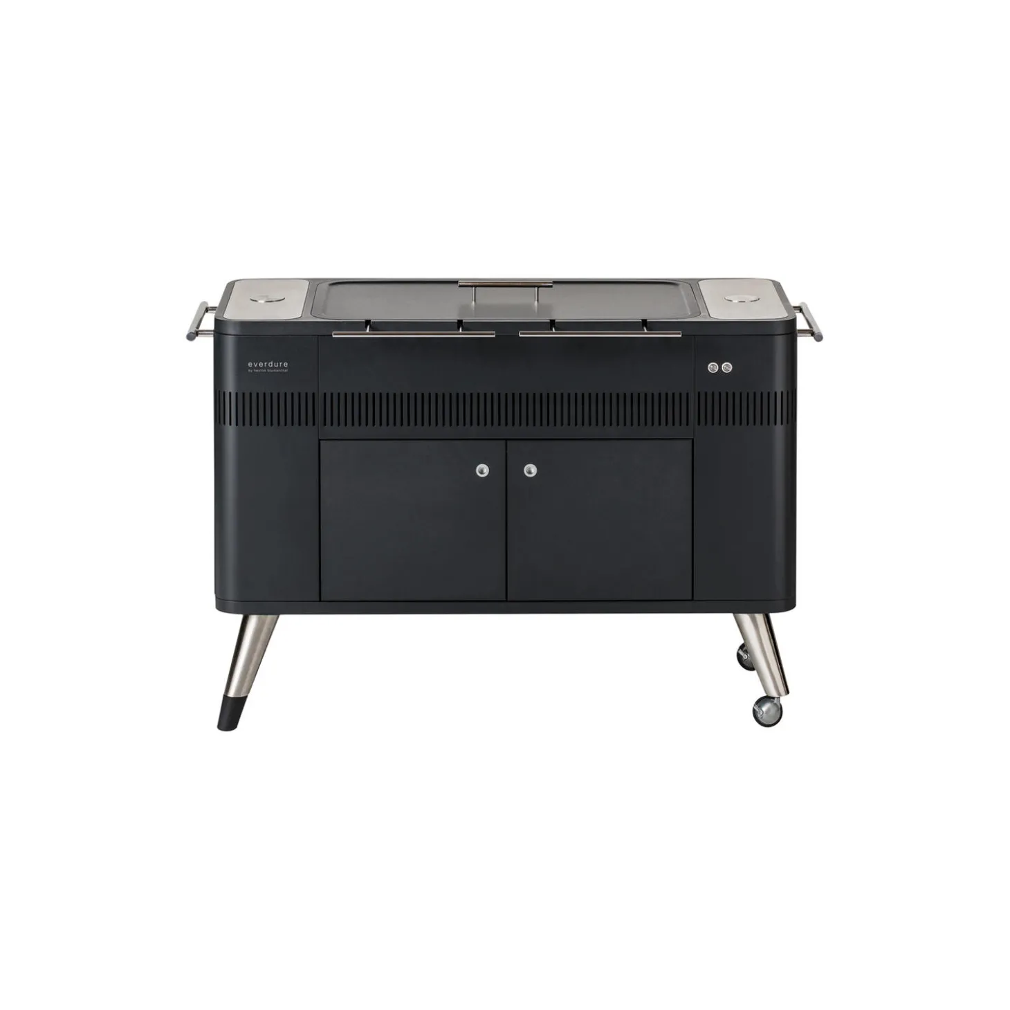 HUB™ kulgrill med fyrkasse i porcelænsemalje fra EVERDURE by Heston Blumenthal. Farve: black. Mål: H: 90 x B: 136,5 x D: 48,7 cm. Med elektrisk tænding og indbygget justerbart rotisseri, der drives af en lydsvag motor. Opbevaringsrum med udtrækshylde. Design: EVERDURE by Heston Blumenthal.