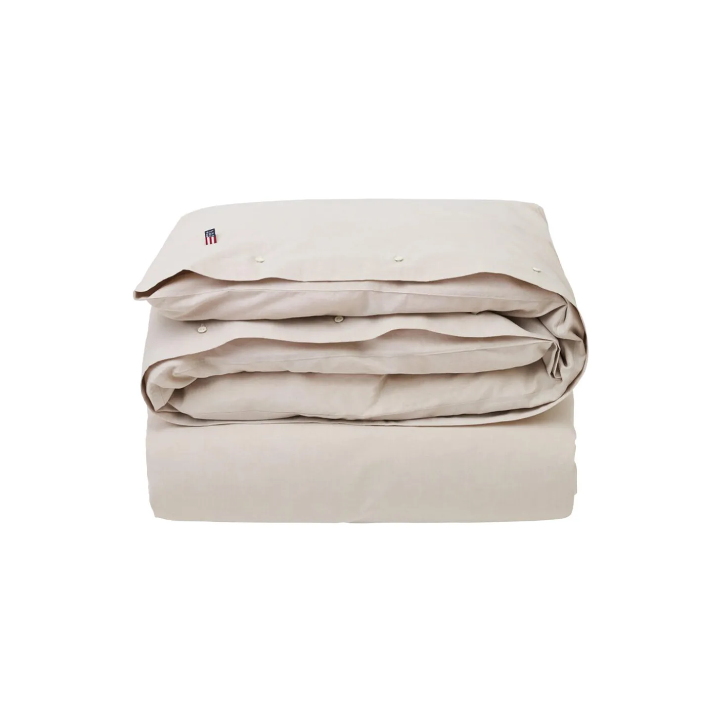 Dynebetrækket i beige er vævet af pinpoint-oxford bomuld og er OEKO-TEX® certificeret. Dette dynebetræk har dobbeltstikninger og lukkes med gummiknapper præget med brandnavnet.