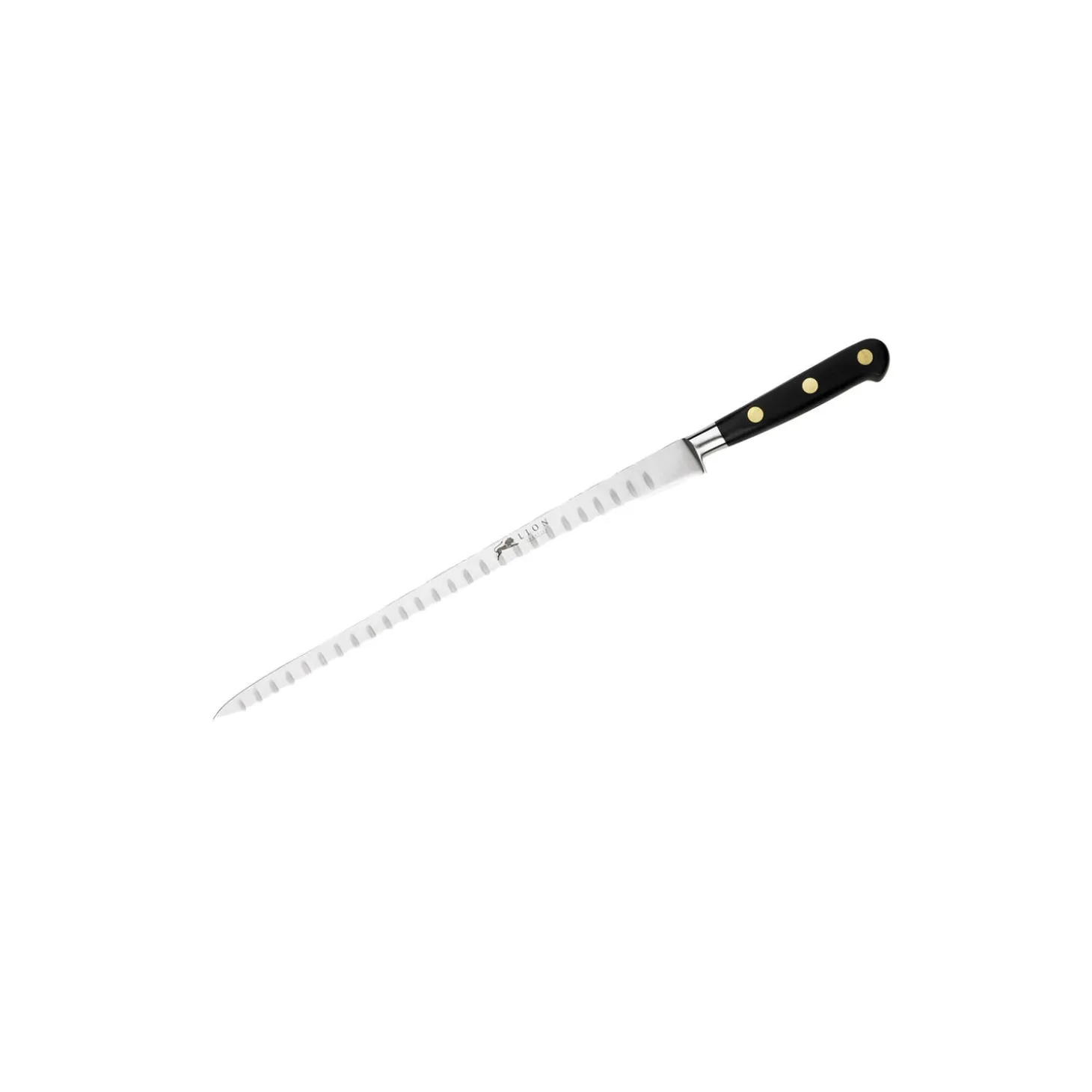 Knivserien Ideal fra Lion Sabatier er helsmedet af ét stykke stål med optimal vægt og balance, der ligger behageligt i hånden. Ét stykke metal fra knivspids til bund af skaft. Hårdt rustfrit stål (X50Cr Mov15 kromstål) med højt kulindhold. Skaft af oliventræ eller POM-C. Skaft påsat med 3 gennemgående messingnitter. Let at vedligeholde – holder skarp længe. Nem at rengøre, men maskinopvask anbefales ikke.