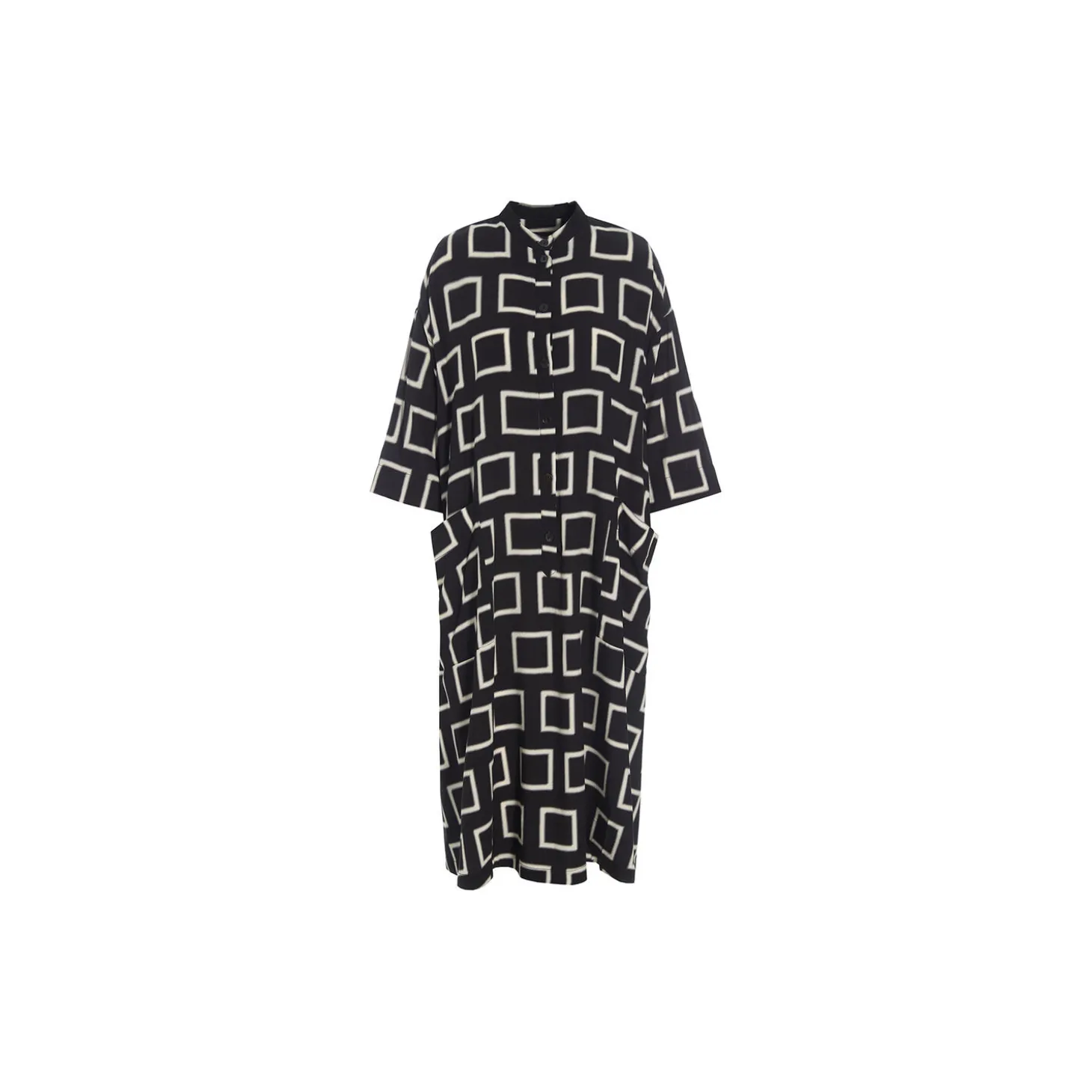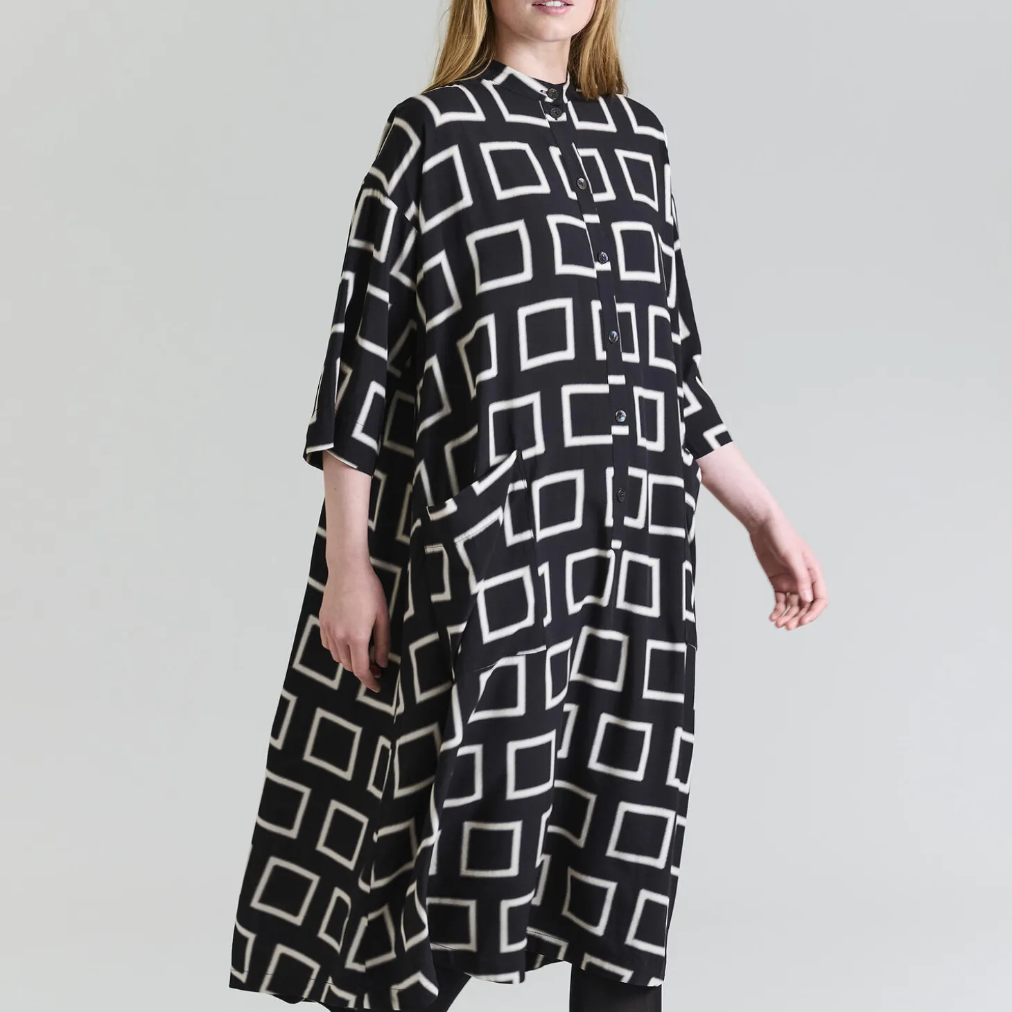 Lang, oversize kjole med et kunstfærdigt grafisk print. Kjolen vil være en iøjnefaldende og cool tilføjelse til garderoben. Den er oplagt at bære i al sin enkelhed uden accessories.