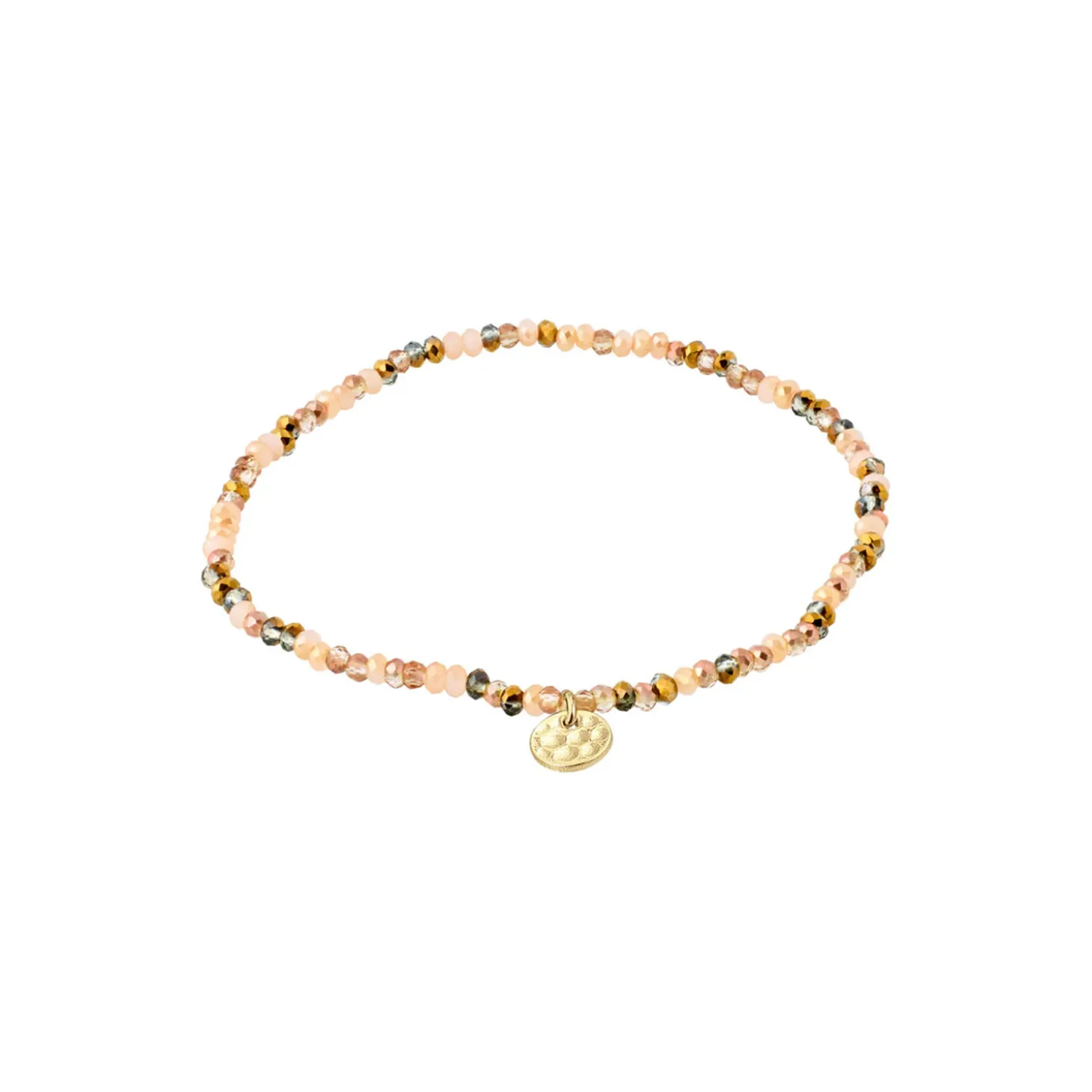 Et smukt funklende armbånd med små facetslebne glasperler i en overdådig beige nuance. Med et diskret guldbelagt Pilgrim-logo. Perfekt sammen med armbånd i samme stil i forskellige nuancer for et unikt, individuelt look. Armbåndet er spændt op med slidstærk lycra-elastik og passer til de fleste håndled. Det måler 17 cm.