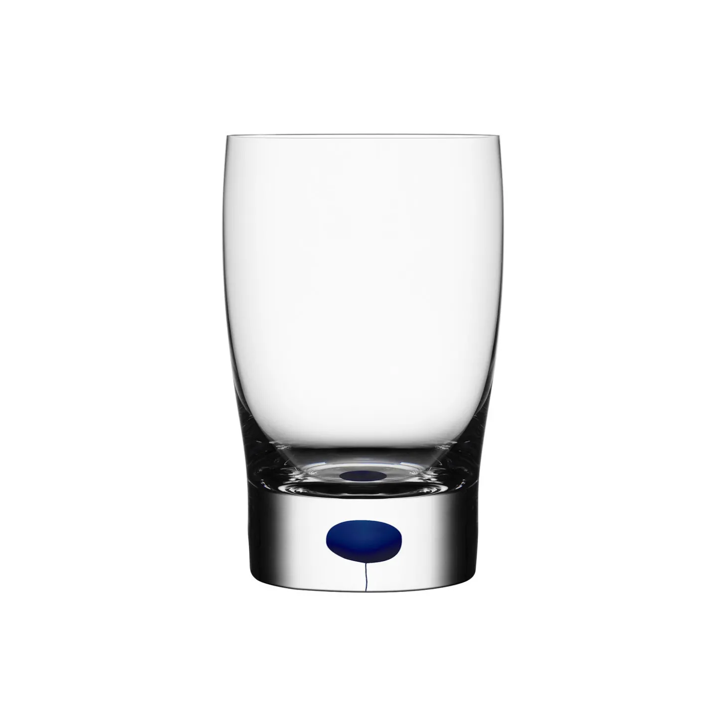Intermezzo Tumbler by Orrefors holds 25 cl and is an all-purpose glass suitable for a wide variety of drinks. In particular, it is excellent for serving water alongside the wine glasses of the series. The glass is mouth-blown in Sweden by expert glassblowers with a drop of blue sealed in the bottom – an innovation based on traditional glass craftsmanship. The series was introduced in 1984 and is designed by Erika Lagerbielke.
