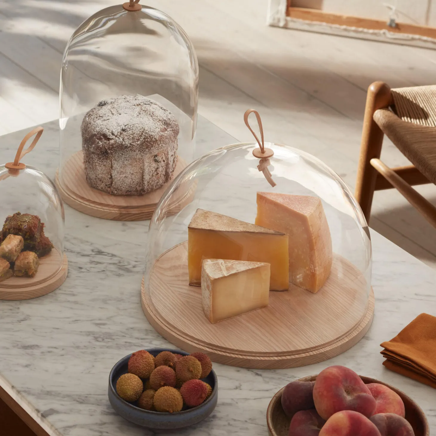 En lille mundblæst glaskuppel med læderhåndtag på naturlig træbund lavet af bæredygtigt aske træ. Designet til servering af en enkelt kage, kiks eller ost.
