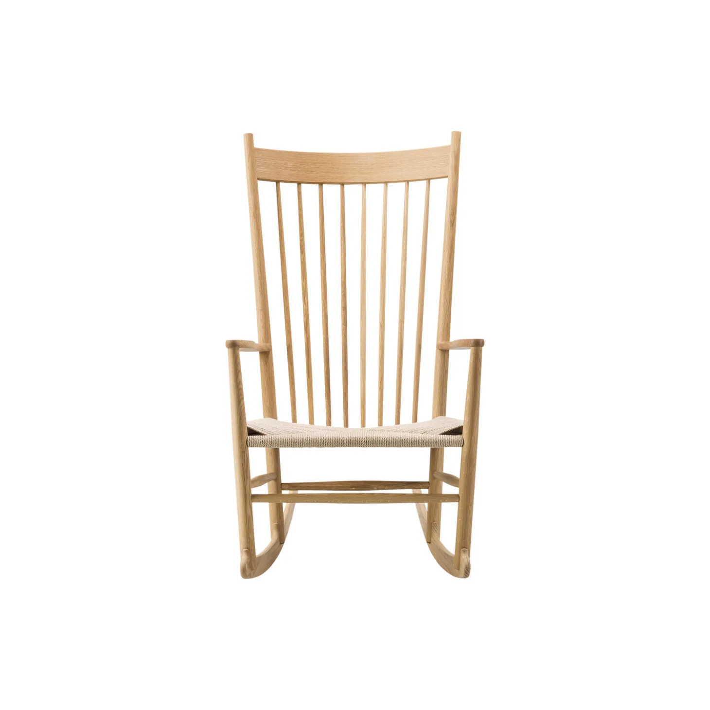 J16 gyngestol i olieret eg med sæde i papirgarn fra Fredericia. Farve: olieret eg/natur. Mål: H: 107 x B: 63 x D: 93 cm. Siddehøjde: 42 cm. Design: Hans J. Wegner.
