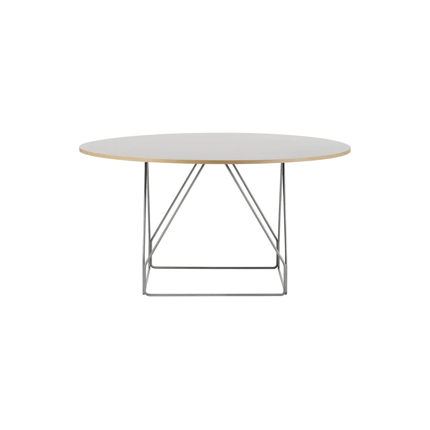 JG Table med bordplade i linoleum og stel i børstet rustfrit stål fra Fredericia. Farve: grey. Mål: H: 72 x Ø 140 cm. Design: Jørgen Gammelgaard.