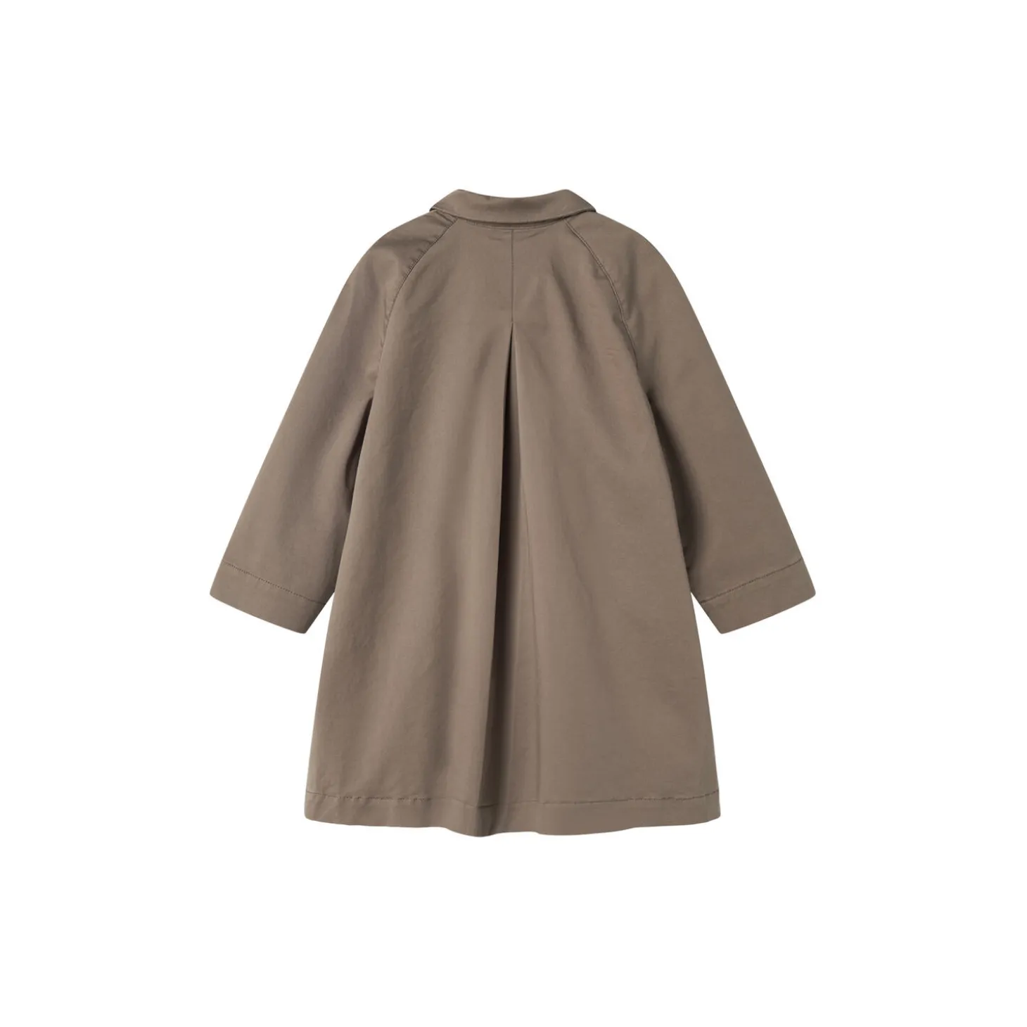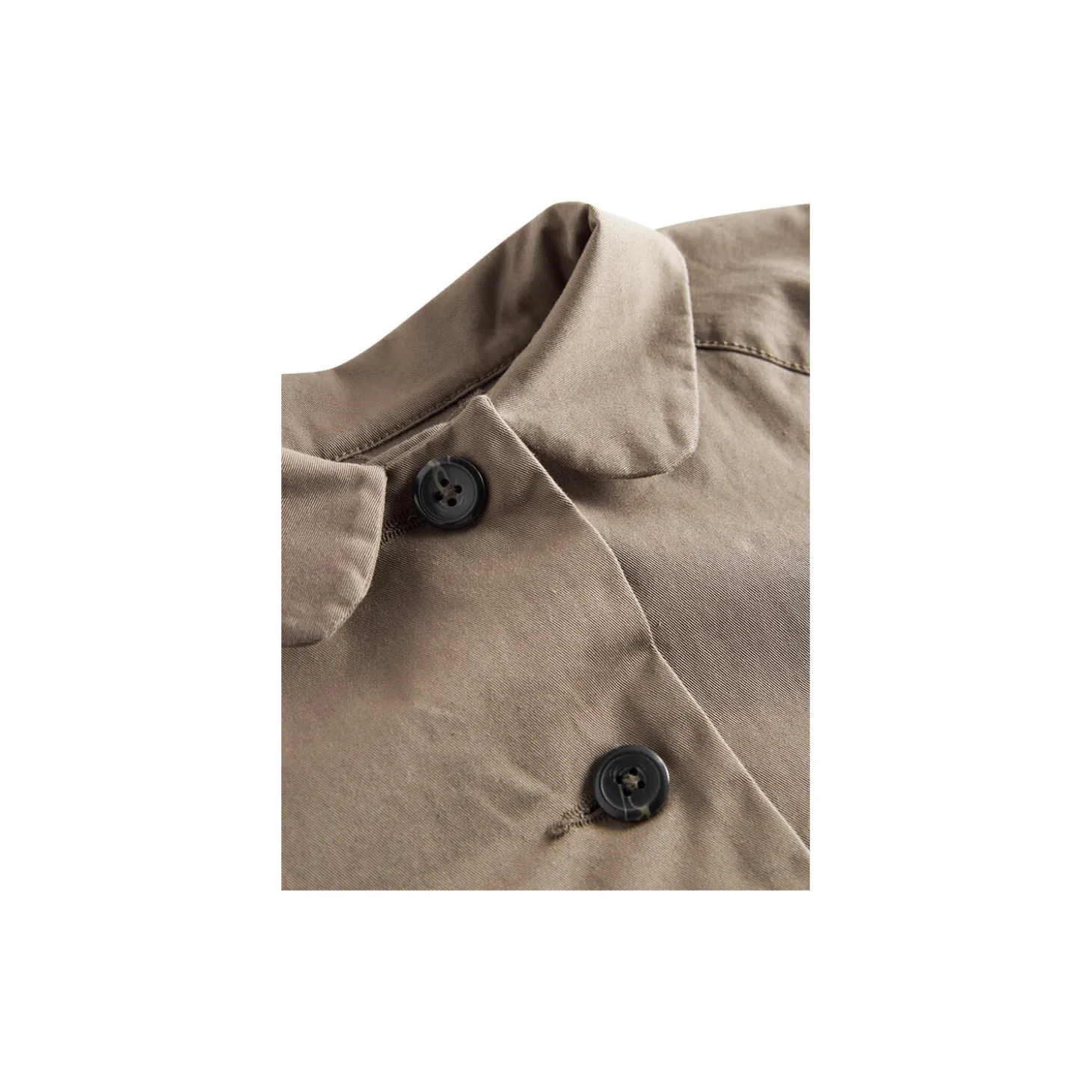 Enkel og klassisk frakke med A-form snit, rund krave og knaplukning foran. Frakken har to lommer foran.