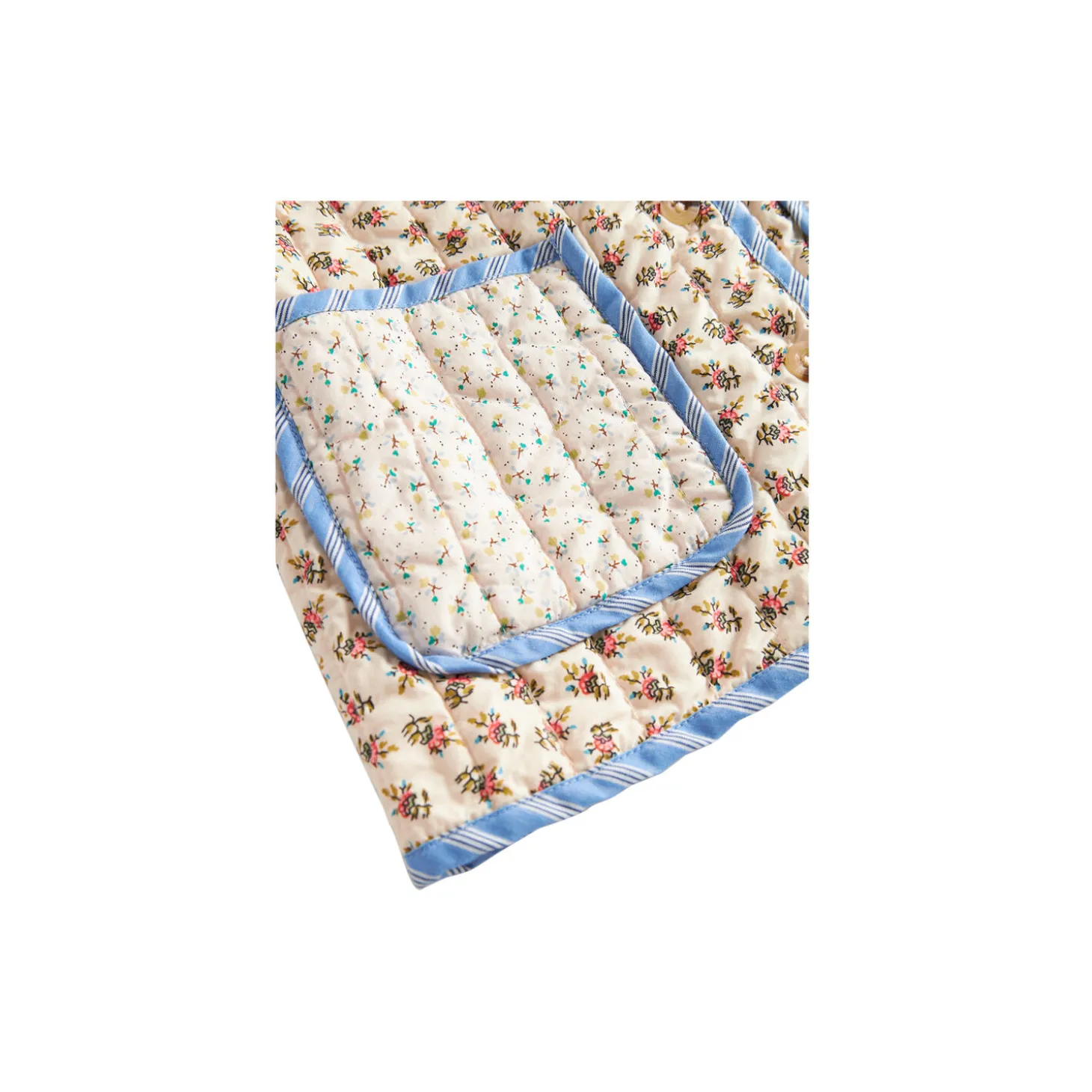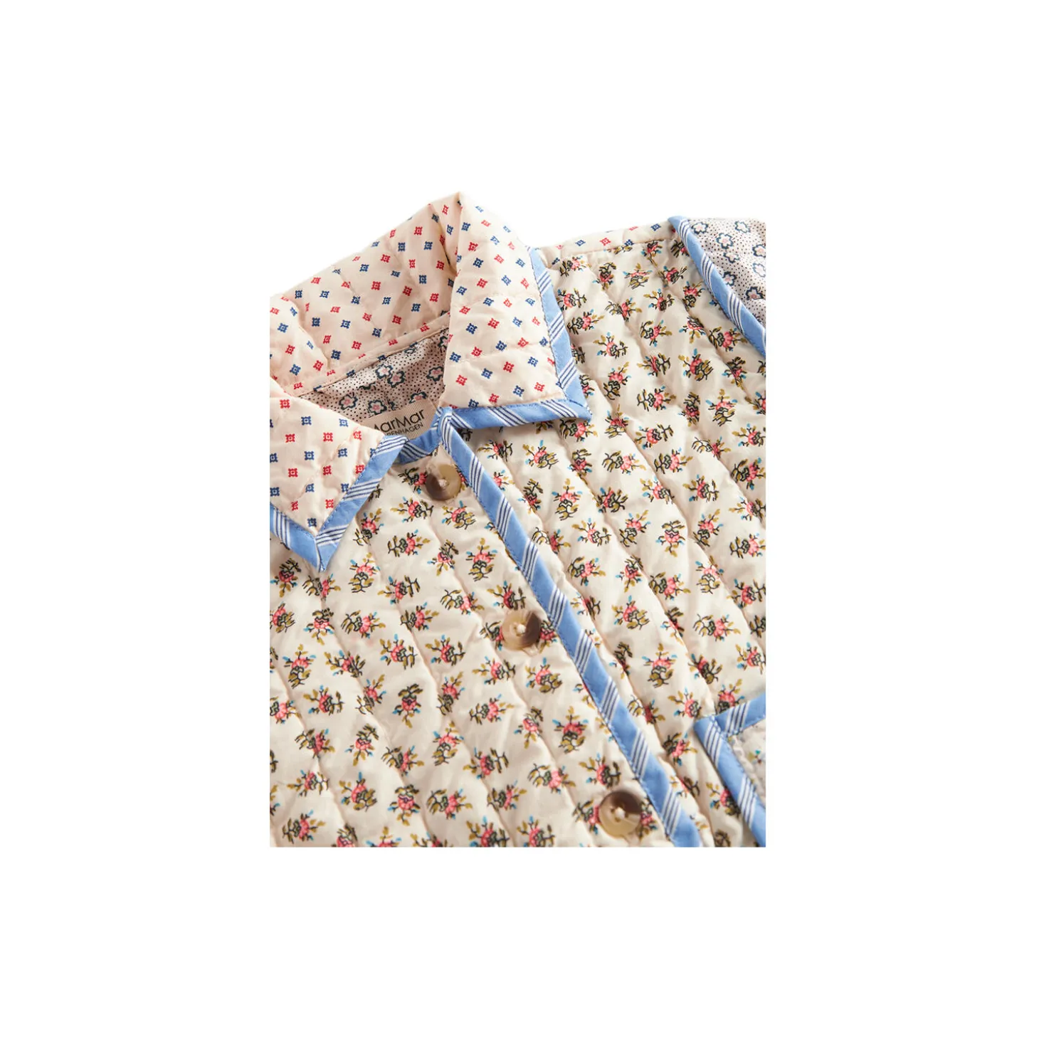 Quiltet jakke med forskellige bomstrede mønstre og kontrastfarvet kantbånd. Jakken har krave, to store rummelige lommer og knaplukning foran. Jakken er perfekt til overgangsvejret.