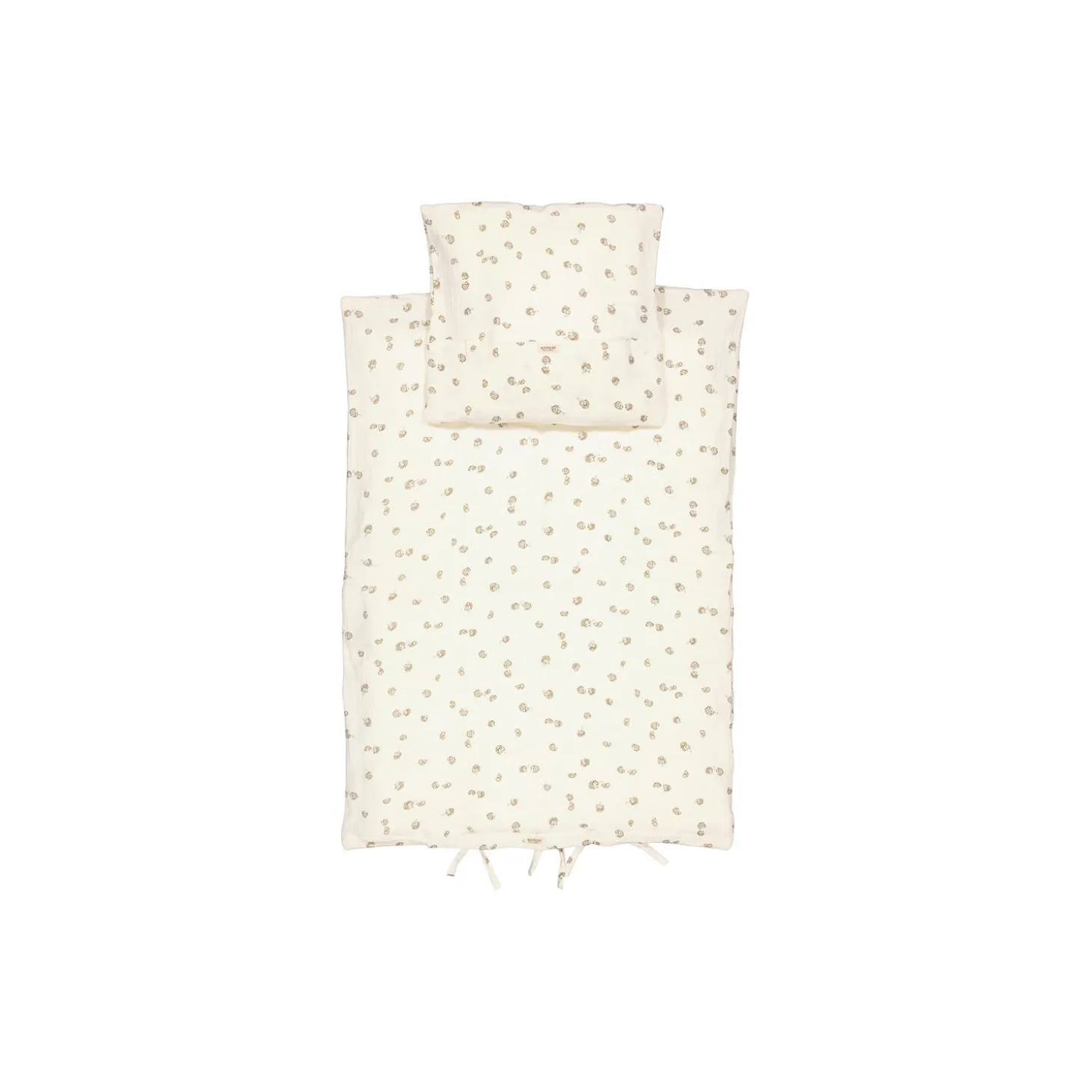 Sengetøj med betræk til dyne og hovedpude. Dynebetrækket lukkes med bindebånd i fodenden.