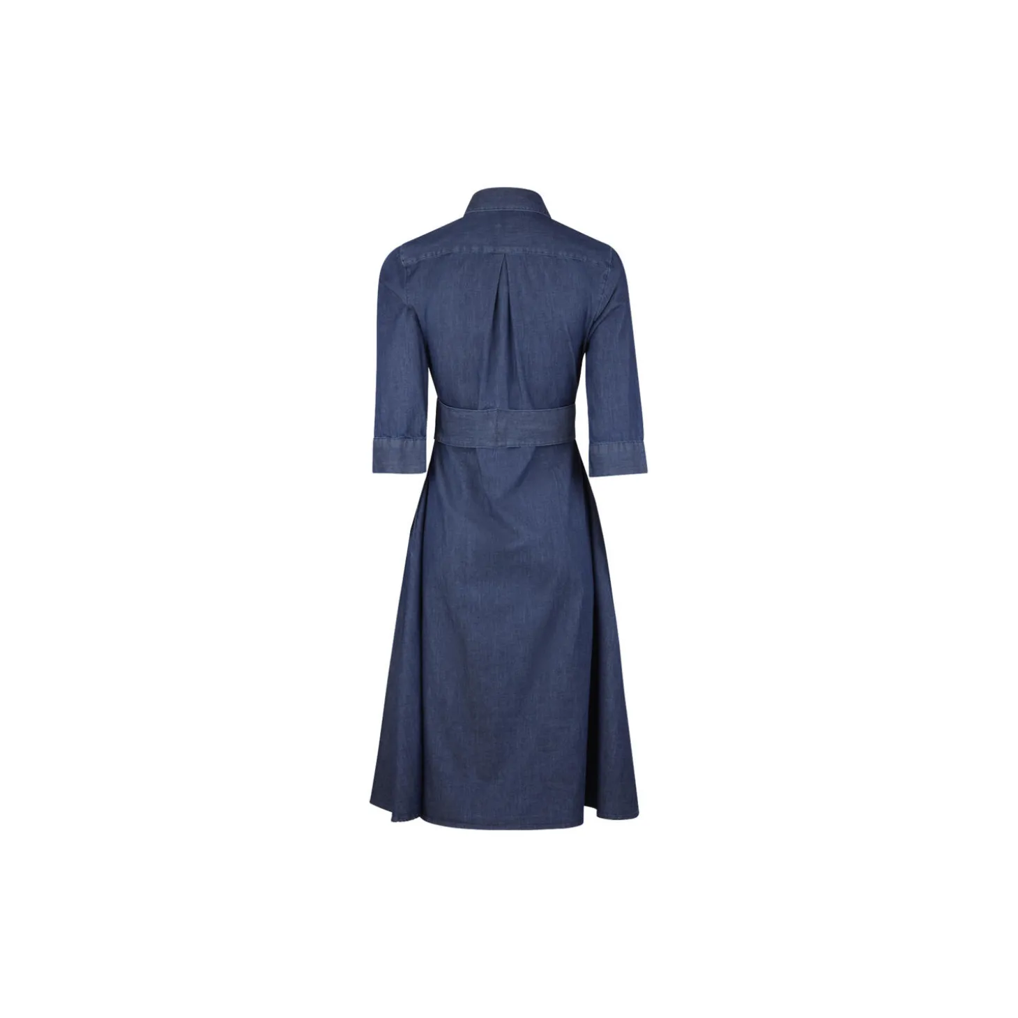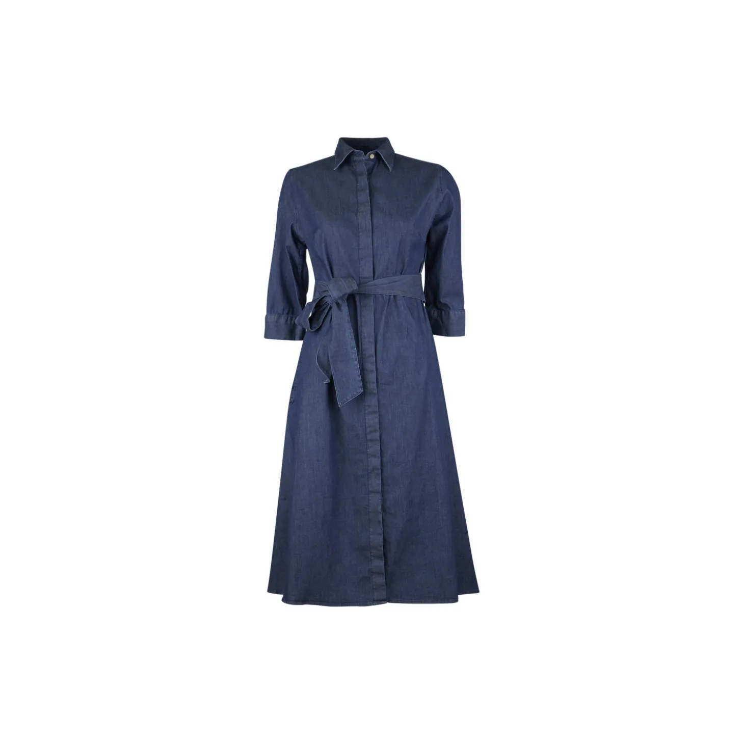 Denne denimkjole er fremstillet i bomuld og har 3/4-lange ærmer, fly front-knapstolpe og bælte i taljen.