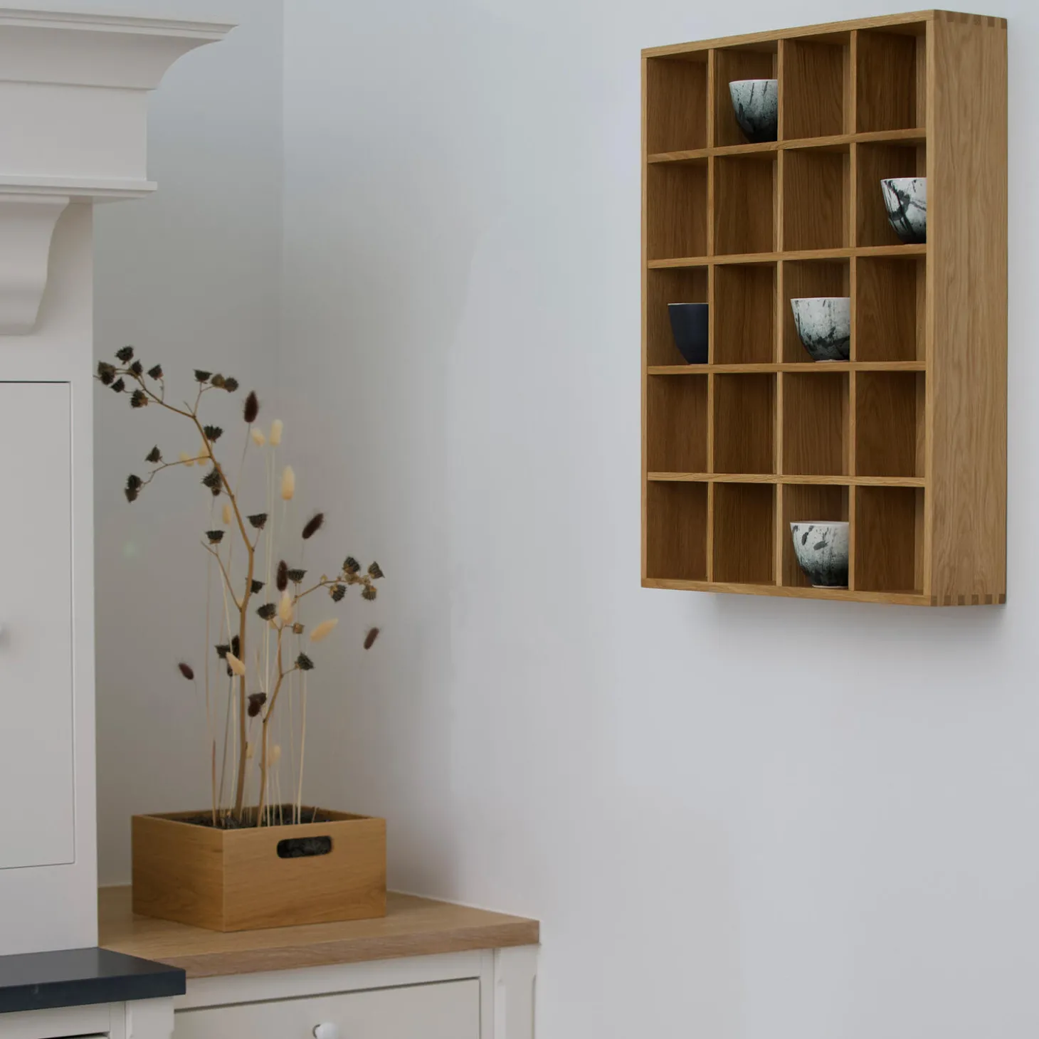 KA32 kopkassen er lavet af højkvalitets europæisk egetræ. Den kan rumme op til 20 kopper. Som en ekstra feature har KA32 det unikke kendetegn, at den er vendbar. Den kan nemlig hænge både lodret og vandret. Med KA32 får du mulighed for at udstille dine kopper på en elegant og kreativ måde. De indvendige mål på rummene er 11,5×11,5×9 cm. Kopkassen har en samlet størrelse på 64×51,5 cm. Beslag til nem ophængning medfølger.