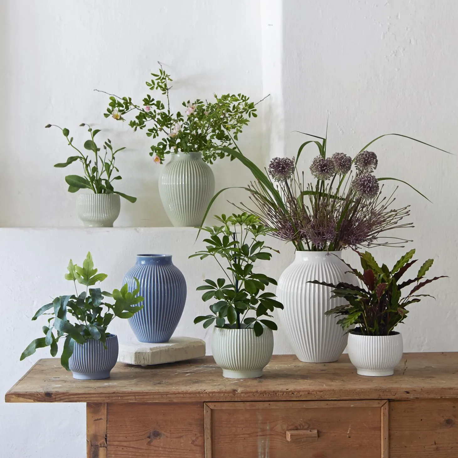 Gennem tiden har Knabstrup Keramik produceret et utal af smukke vaser i forskellige formgivninger. Denne vase er vi særligt stolte af. Den blev oprindeligt formgivet i slutningen af 1940’erne og med sin elegante og klassiske form er vasen et tidløst stykke keramik, der holder stilen langt ind i fremtiden. Knabstrup vasen er designet, så den ikke bare præsenterer sig selv, men også sæsonens blomsterbuketter og grene på smukkeste vis. Nu lanceres vasen med riller, hvilket giver den klassiske form helt nyt liv og giver et moderne og interessant udtryk, som passer perfekt ind i den nordiske boligindretning.