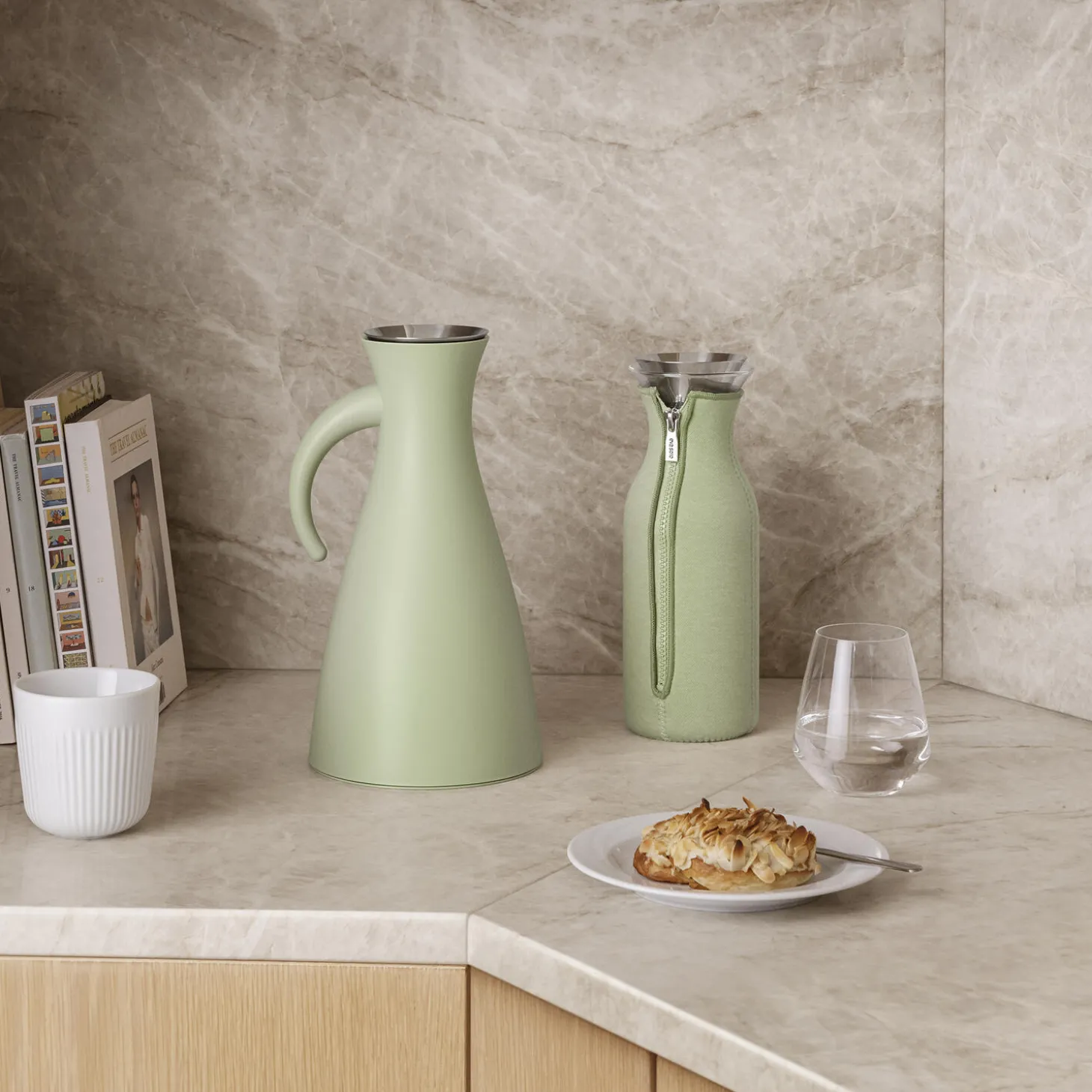 Karaflen passer i de fleste køleskabslåger og er velegnet til både kolde og varme drikke. Den 100% drypfri hældekrave i rustfrit stål sikrer, at indholdet ender i glasset og ikke på dugen. Vippelåget åbner automatisk, når du hælder, hvilket gør en-håndsbetjening mulig, og forbliver forseglet, når det ikke er i brug. Den karakteristiske dragt gør karaflen behagelig at betjene, hjælper med at bevare indholdets temperatur og absorberer kondensvand, så det ikke ender som pletter på køkkenbordet. Dragten er lavet af neopren med en yderside af vævet tekstil. Glas- og metaldele tåler maskinopvask. Dragten kan maskinvaskes ved 30 grader.