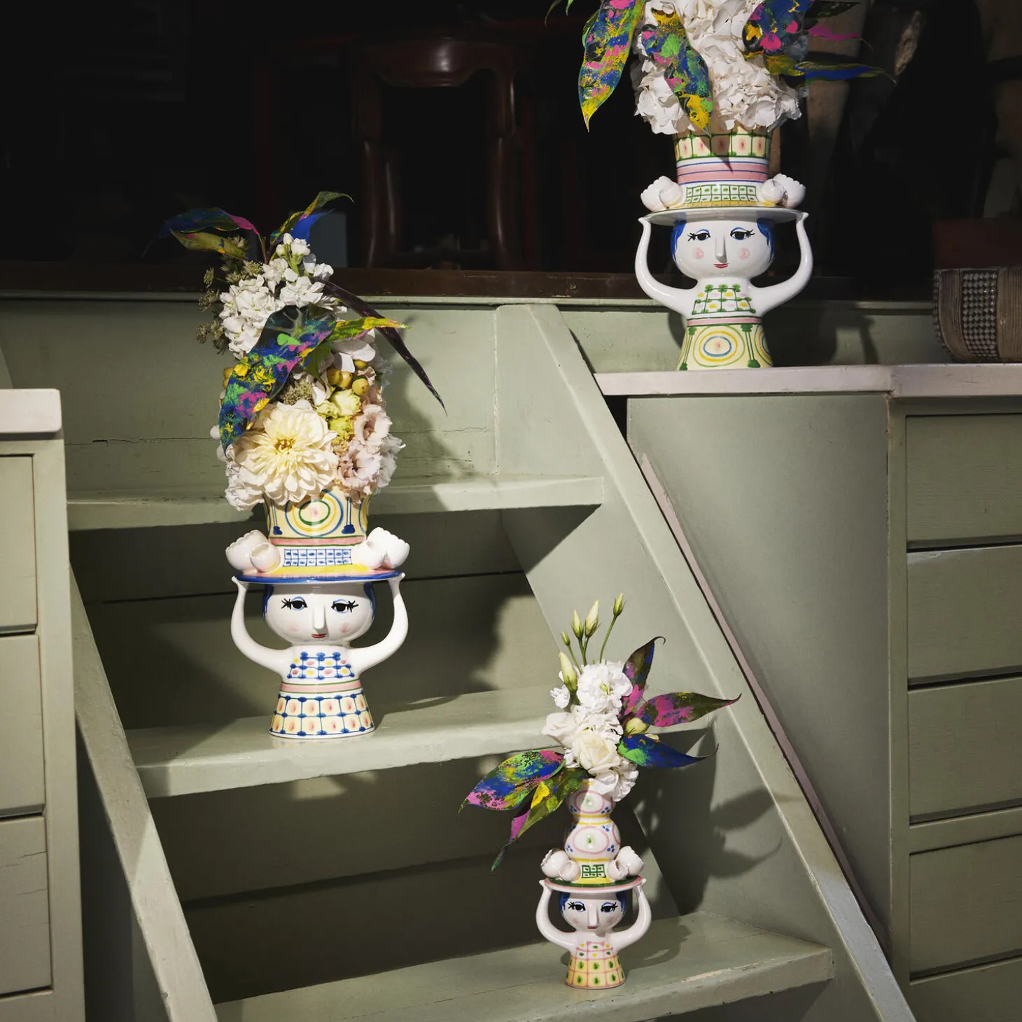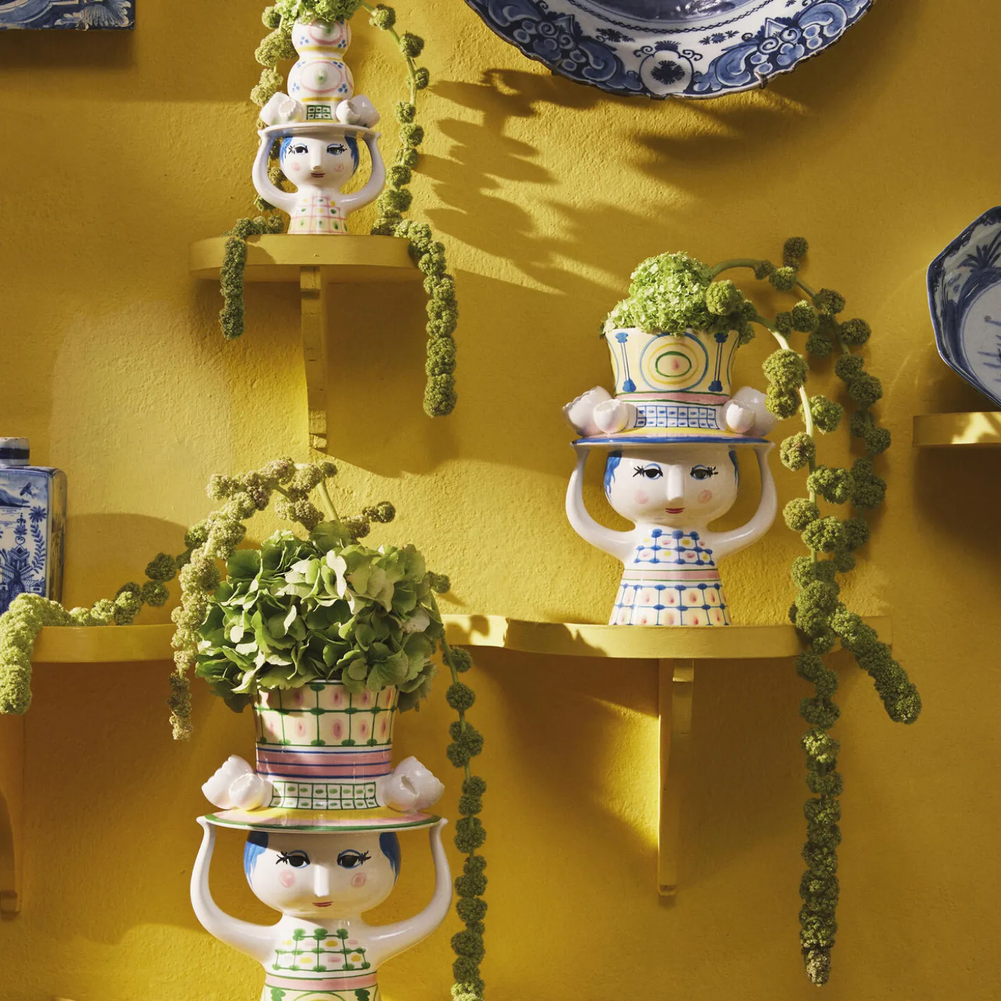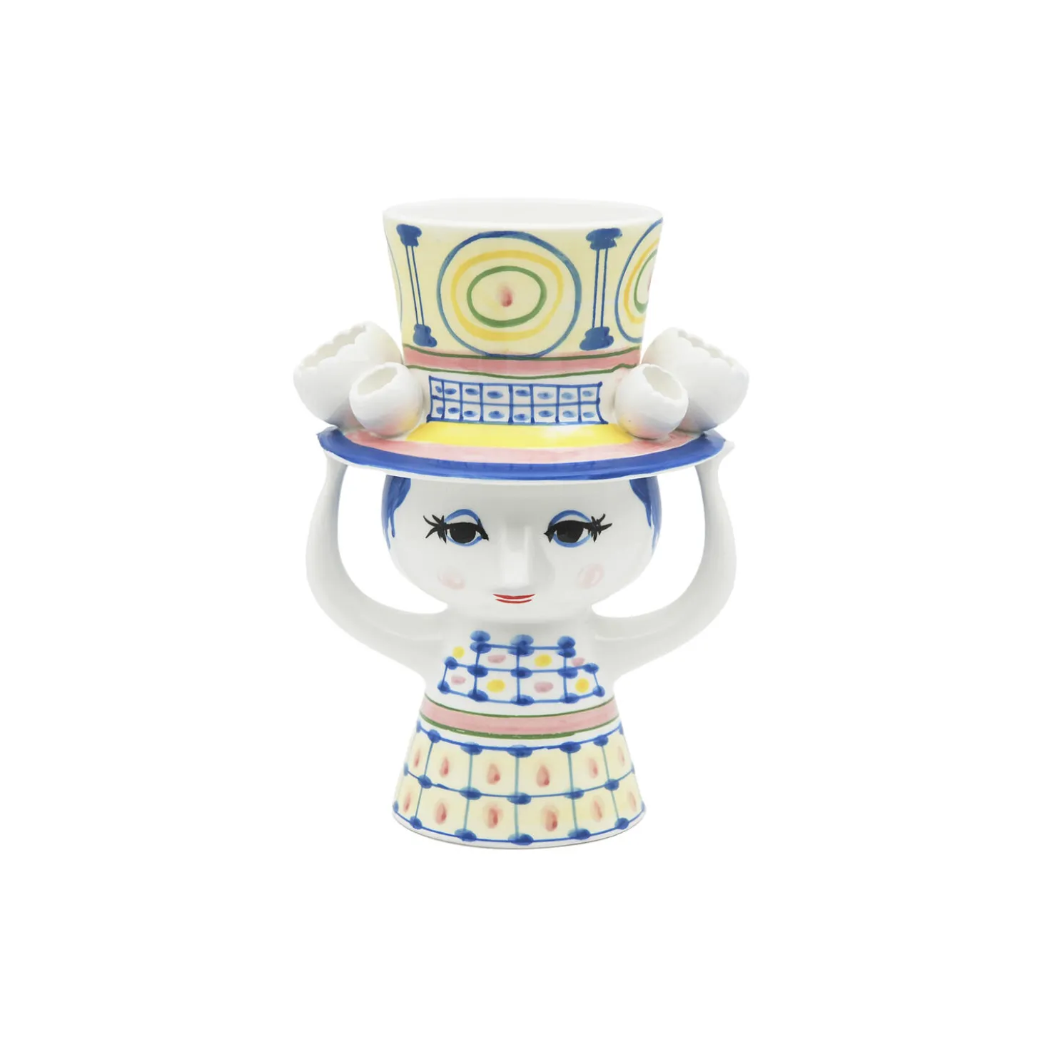 Invitér den nye hattefrøken indenfor, og lad hende skabe glæde i boligen med sine fine farver, finurlige detaljer og håndmalede dekorationer. Bjørn Wiinblad havde en forkærlighed for figurer med hatte, og arkiverne rummer utallige eksempler på, hvordan hatten dukker op igen og igen på nye, kreative og legende måder. Han designede selvfølgelig ikke små, fine pyntehatte. Nej, det var store voluminøse kreationer, der var både skulpturelle og avantgarde i deres udtryk – præcis som i serien Lady with hat. Vasen i blankglaseret keramik på 20,5 cm er præget af den blå farve, og skørtets stringente linjer står i skøn kontrast til hattens cirkulære former. Som et lille tårn vokser hatten op mod himlen, mens den fine frøken balancerer den med sine hænder. Det giver vasen et finurligt og fantasifuldt udtryk perfekt til blomsterbuketten i den legende boligindretning. En anden detalje, der er gennemgående i serien, er de små, figurative blomster, der er placeret langs skyggen på hattene. Endnu en dekorativ detalje inspireret af Bjørn Wiinblads originale former og farver. Præcis som Bjørn Wiinblad repræsenterer Lady with hat alt, hvad der er skørt, skævt, kreativt og vidunderligt.