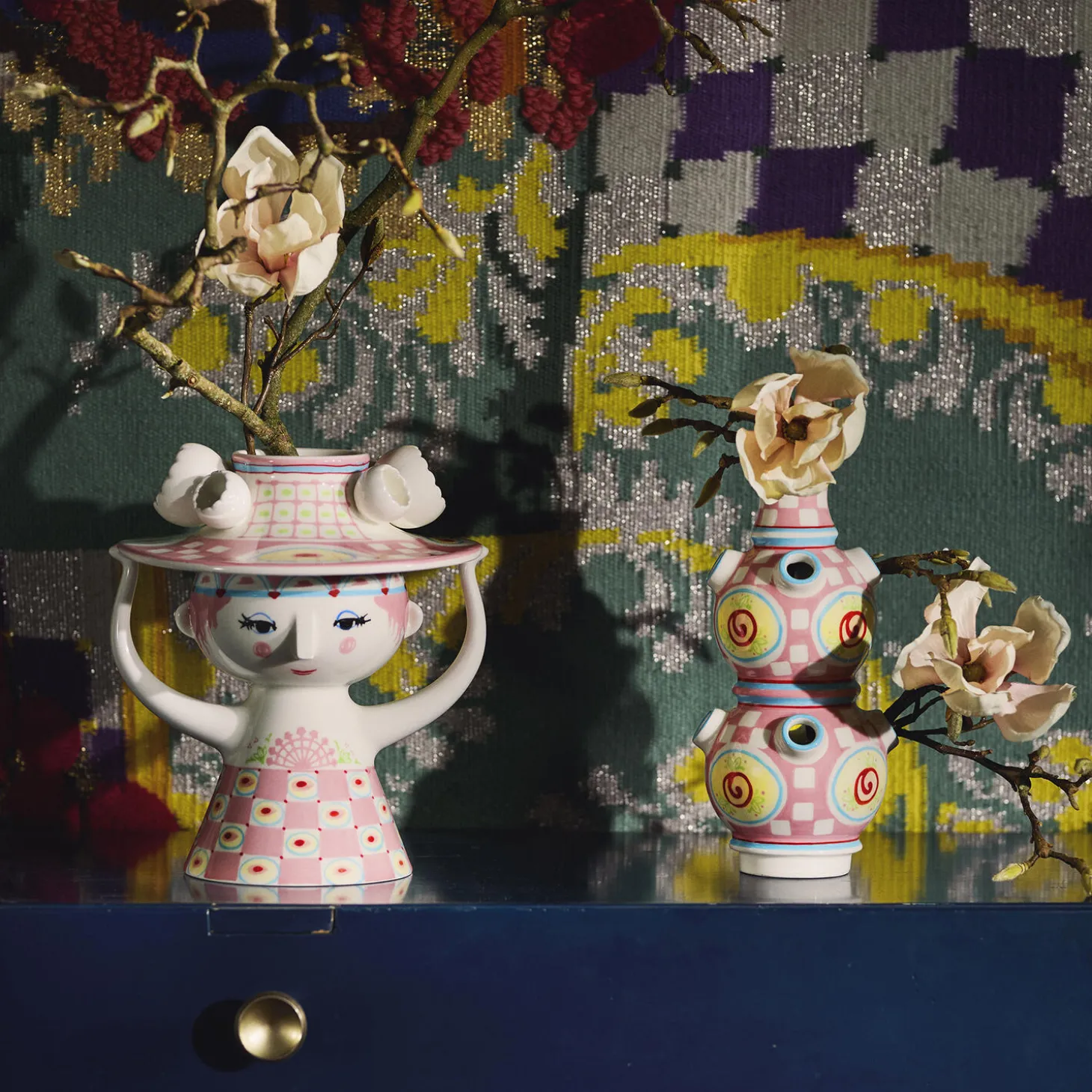 Invitér en rigtig Lady indenfor og lad hende skabe glæde i boligen med sine fine farver, finurlige detaljer og håndmalede dekorationer. Bjørn Wiinblad havde en forkærlighed for figurer med hatte, og arkiverne rummer utallige eksempler på, hvordan hatten dukker op igen og igen på nye, kreative og legende måder. Han designede selvfølgelig ikke små uanseelige pyntehatte. Nej, det var store voluminøse kreationer, der var både skulpturelle og avantgarde i deres udtryk – præcis som i serien Lady with hat. Og Bjørn Wiinblads univers bliver nok heller ikke meget mere magisk, fantasifuldt, fantastisk og overdådigt, end det er tilfældet med denne helt spektakulære vase i glaseret keramik. Den omfavner til fulde alt, hvad der er skørt, skævt, kreativt og vidunderligt i Bjørn Wiinblads verden. Vasen måler intet mindre end 50 cm i højden og er hånddekoreret fra top til tå med motiver inspireret af Bjørn Wiinblads mangfoldige arkiv. Og det er ikke bare én vase. Vasen består af to individuelle vaser, der både fungerer sammen og kan stå alene. Vasens base prydes af det ikoniske ansigt med den trekantede næse, de mandelformede øjne, rosenrøde kinder og det finurlige smil på læben. Med sine skulpturelle arme holder den håndmalede hattefrøken den store hat, der er udsmykket med yndige tulipaner formet i keramik på hver side. Kjolen er fuldt dekoreret med cirkler og striber i en frisk og dristig pink nuance, der er smukt afbalanceret i lysegule, lyseblå, grønne og røde toner – farver der bringer positivitet, varme og bidrager med masser af lysstyrke. Og går du lidt tættere på, vil du også finde de sødeste håndmalede roser og ternede mønstre med små åbninger i siderne, som dine yndlingsblomster kan falde yndefuldt ned i. I bunden af begge vasens dele ses den originale Bjørn Wiinblad-signatur og en tekst, der dokumenterer, at vasen er håndmalet – et bevis på at du er sikret dit helt eget unikke håndmalede designikon. Brug vasen til at give dine gæster en overdådig velkomst i entreen eller som et statement på skænken, i vindueskarmen eller på bordet.