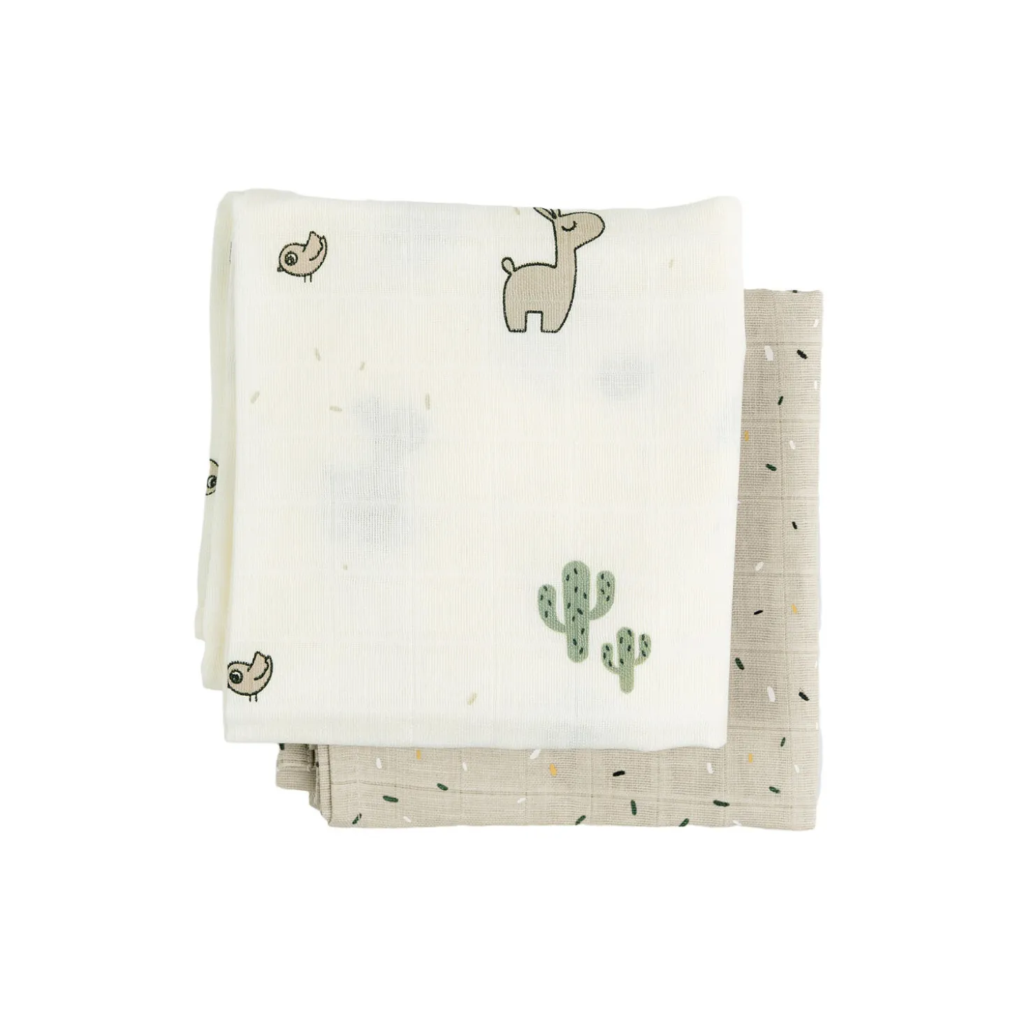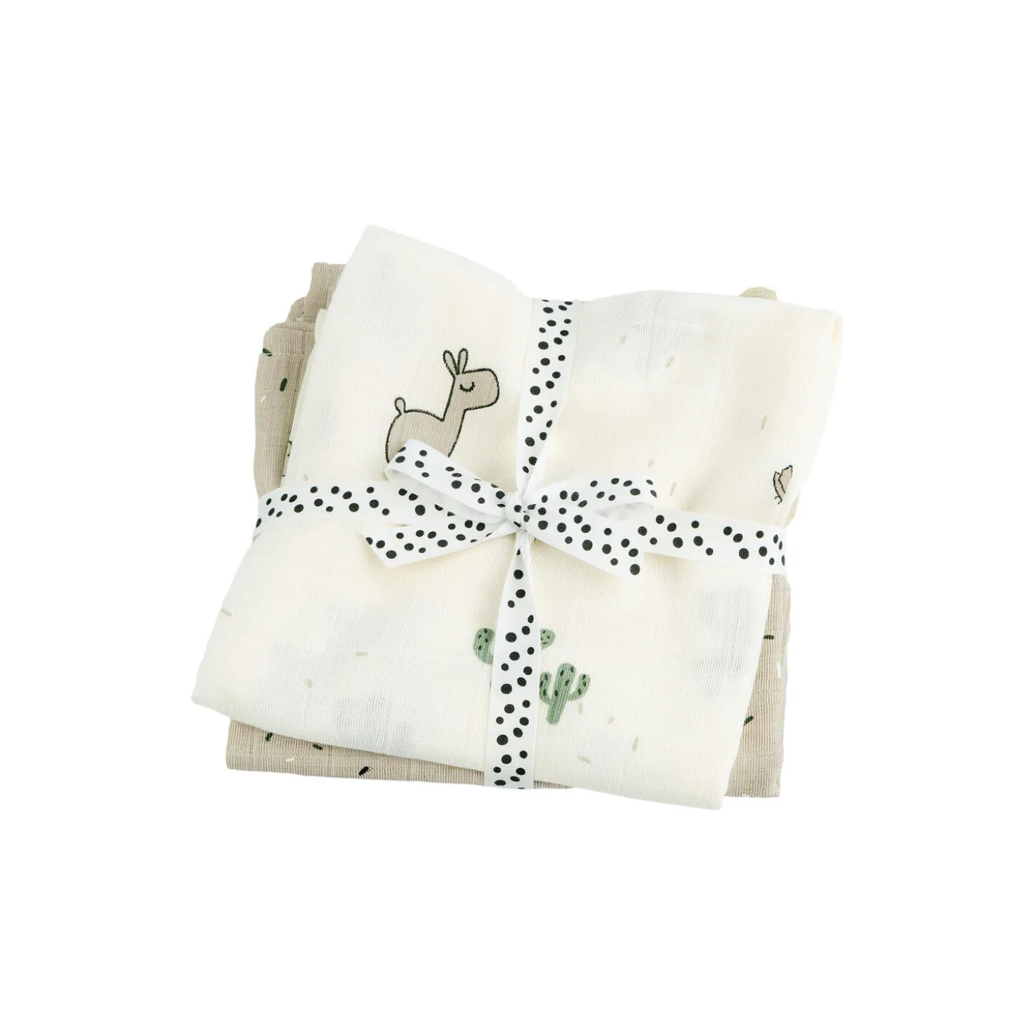 Et sæt med to svøb dekoreret med det søde Lalee print med lamaen, fuglen Birdee og sjove kaktusser. De økologiske, GOTS-certificerede muslin svøb er behagelige, åndbare og flotte – must-haves til en lille ny. Brug et svøb til at efterligne det trygge miljø din baby kender fra livmoderen, og undgå at barnet flagrer med arme og ben og vækker sig selv når det sover. Det er behageligt og trygt for din baby at blive pakket ind i dette store svøb med Lalee. Et sødt sæt med svøb i lyse sandfarver. Svøbene er vaskbare ved 60 grader og bliver endnu blødere efter vask. Det vamsede vaffel-look de får efter vask er en naturlig kvalitet ved materialet.