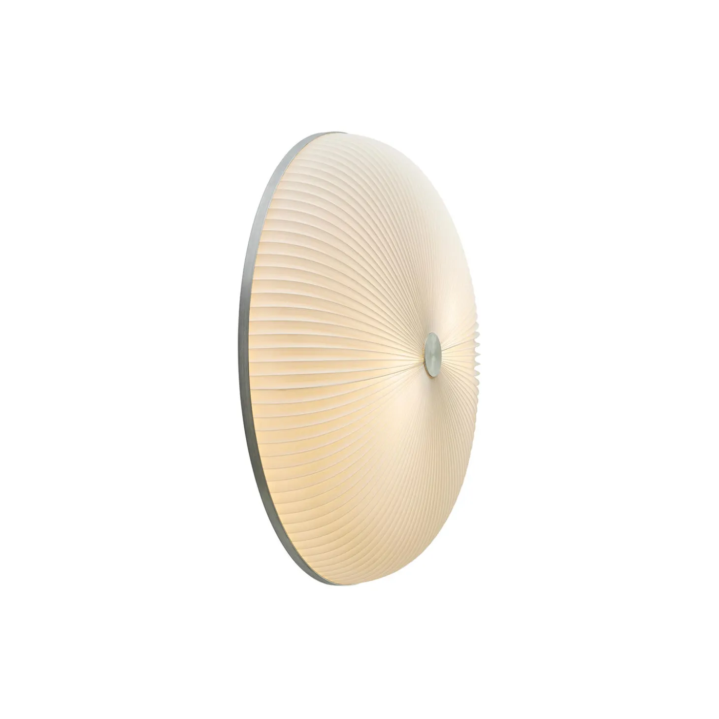 Lamella 236 væg/loftlampe i plast og børstet aluminium fra LE KLINT. Farve: hvid/aluminium. Mål: H: 13 x Ø 50 cm. Lyskilde: E27 LED. Design: Takagi & Homstvedt.