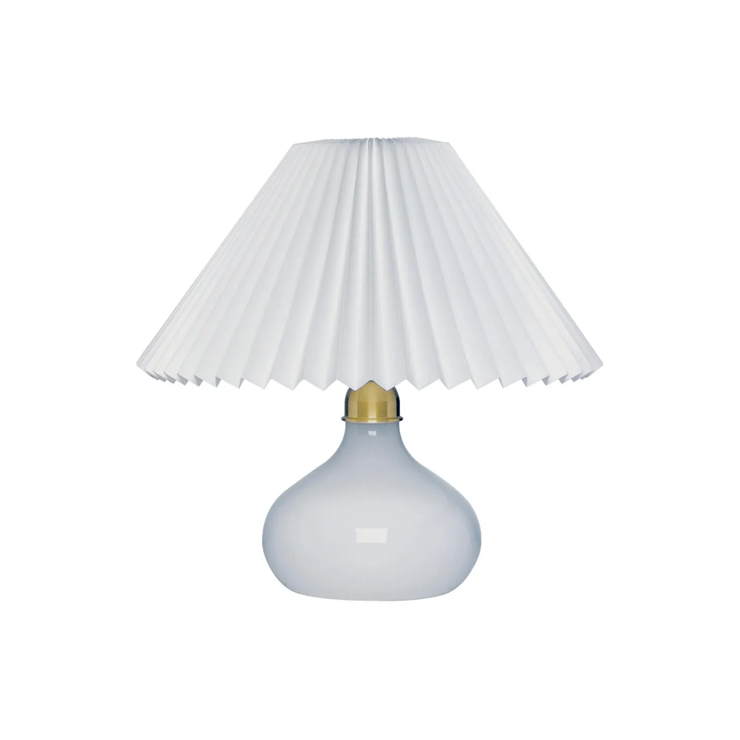 LE KLINT 314 bordlampe med 2/17 skærm i håndfoldet plast og lampefod i glas fra LE KLINT. Farve: hvid/messing. H: 27 x Ø 30 cm. Lyskilde: maks. 25W E27. Design: Andreas Hansen.