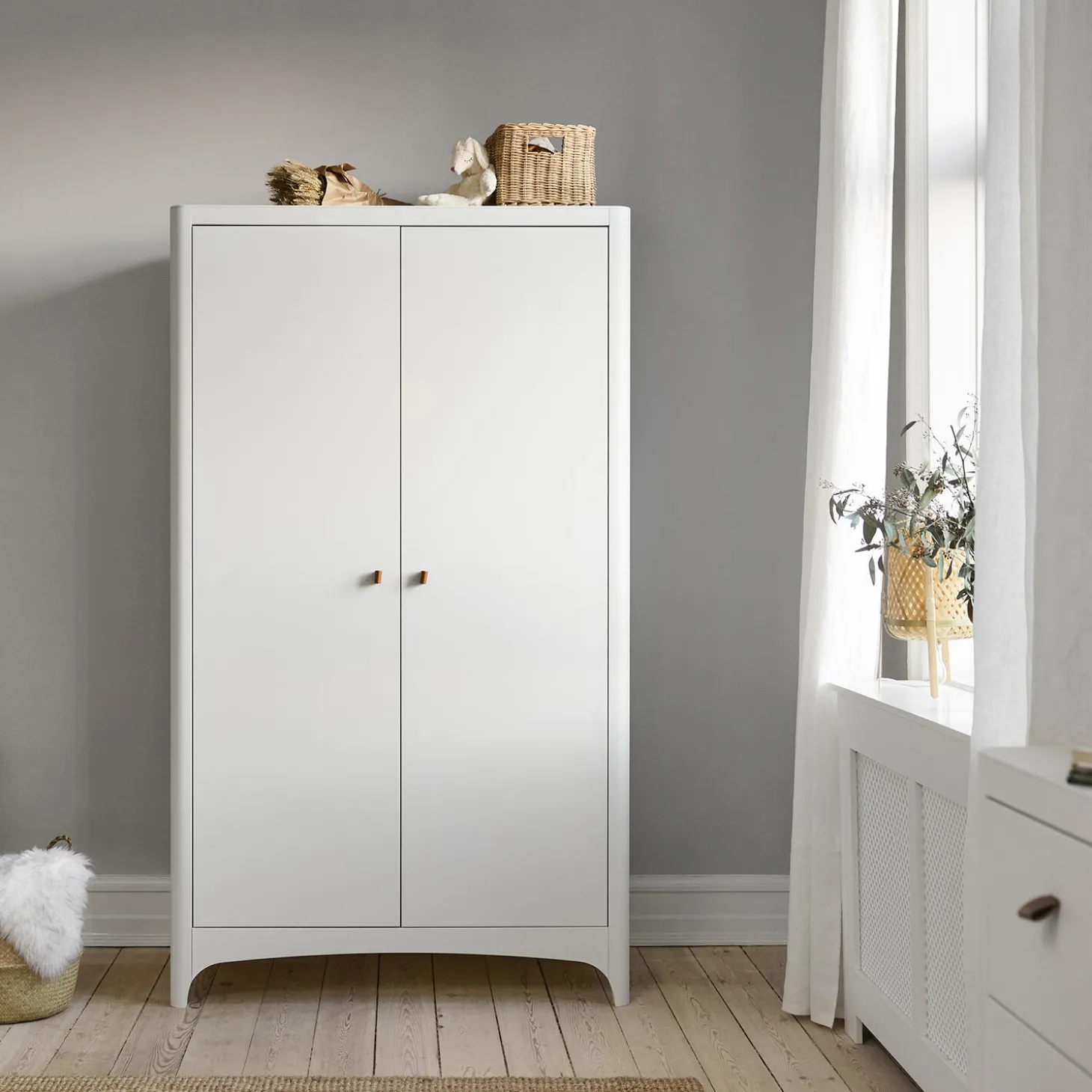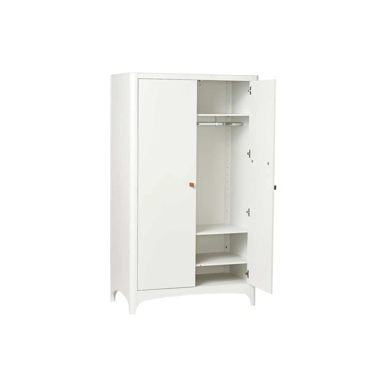 Hold orden på børneværelset med det smukke og rummelige Leander Classic™ garderobeskab. Med sine ikoniske buer og afrundede hjørner matcher garderobeskabet det unikke designsprog, som Leander Classic™ serien er kendt for. Skabet er godt indrettet med en bøjlestang til bøjler samt tre dybe hylder med god plads til opbevaring af tøj og tilbehør.Skabet har bløde lædergreb, der nemt kan skiftes til andre farver eller filtgreb, så du får dét udtryk, der passer til din stil. Skab et komplet børneværelse ved at tilføje andre møbler fra Leander Classic™ serien, eksempelvis baby-juniorsengen og kommoden.Udnyt pladsen i skabet optimalt ved at tilføje Leanders praktiske opbevaringsbeholdere. Opbevaringsbeholderne monteres på indersiden af skabslågen og giver dig ekstra plads til diverse tilbehør.