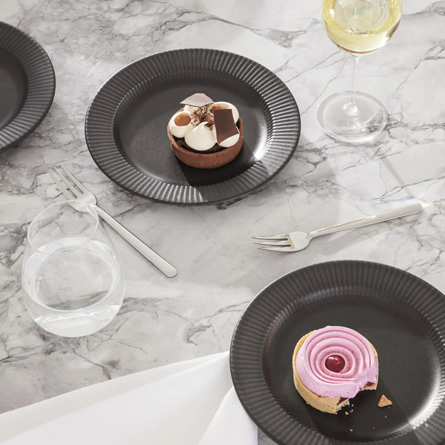 Server forretter eller desserter på de elegante kagetallerkener, hvis rillede design indrammer og fremhæver maden. Legio Nova Black er en genfortolkning af det populære Legio Nova stel med en matsort finish inspireret af det rustikke, nordiske køkken. Med sit mørke farveunivers og de karakteristiske riller tilføjer stellet en spændende kontrast og dybde til enhver bordopdækning. Stentøjet er af højeste kvalitet og kan tåle alt fra ovn og fryser til mikrobølgeovn og opvaskemaskine. Legio Nova stellet er dækket af en 10-års garanti (scan QR-kode for mere information).
