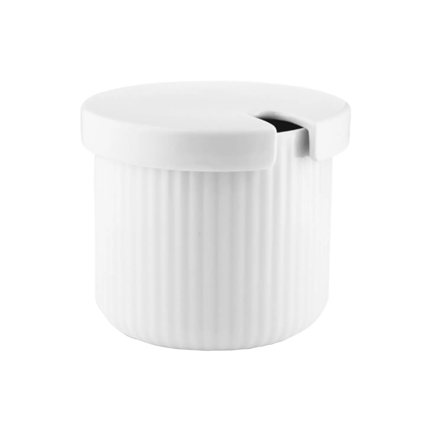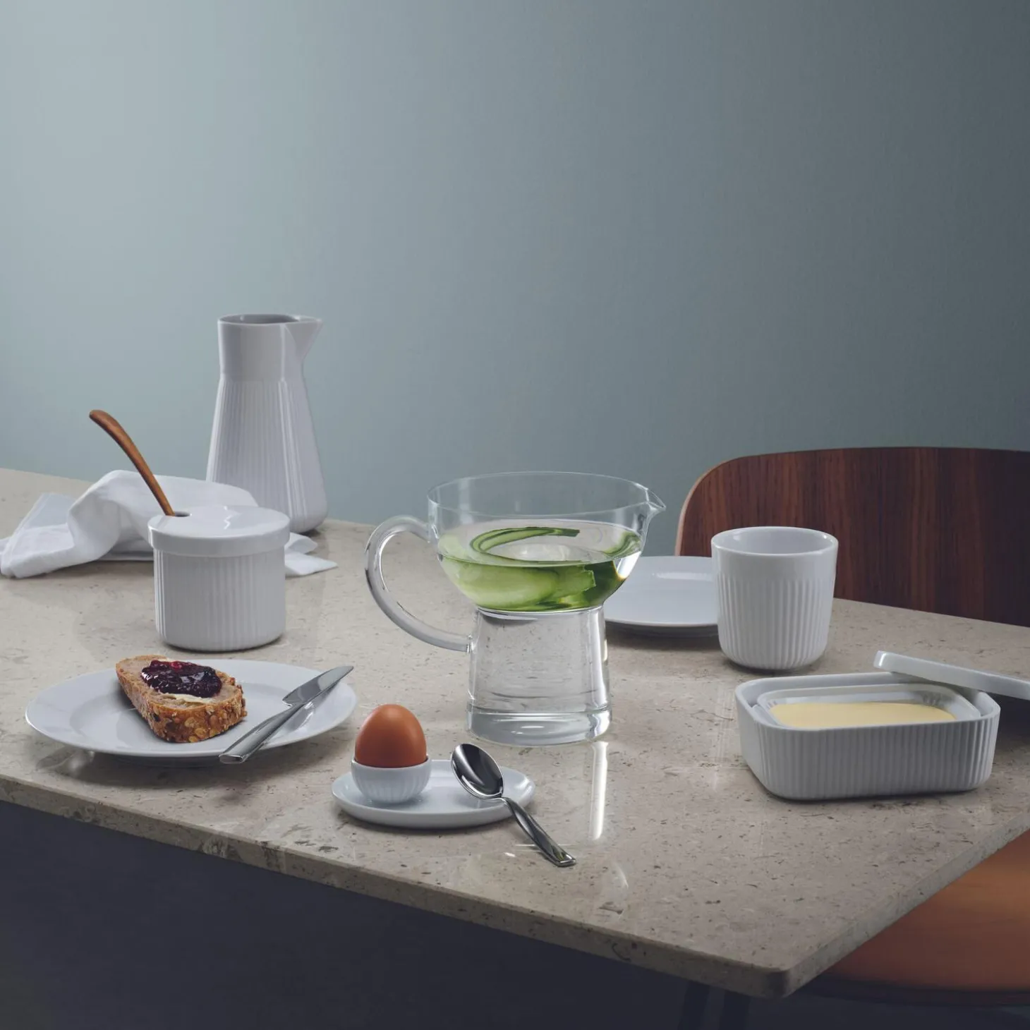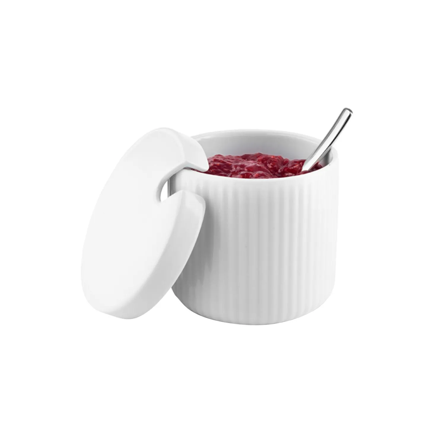Eva Trio Legio Nova er en ny fortolkning af det klassiske Eva Trio Legio stel, designet af Ole Palsby. Med sin rillede, delikate dekoration står Legio Nova smukt alene, men kan også med fordel matches med Legio stellets tidløse enkelthed. Krukken med låg har mange anvendelsesmuligheder. Den kan f.eks. bruges til krydderier, nødder eller marmelade. Indhakket i låget gør, at der er plads til teskeen, så den altid er lige ved hånden. Legio Nova har 10 års porcelænsgaranti og tåler både ovn, mikroovn, fryser og maskinopvask.