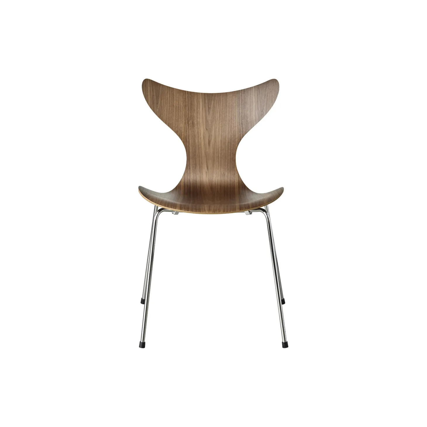 Liljen™ 3108 stol med skal i lakeret formpresset finér og stel i forkromet stål fra Fritz Hansen. Farve: valnød. Mål: H: 83 x B: 54 x D: 49 cm. Siddehøjde: 46 cm. Design: Arne Jacobsen.