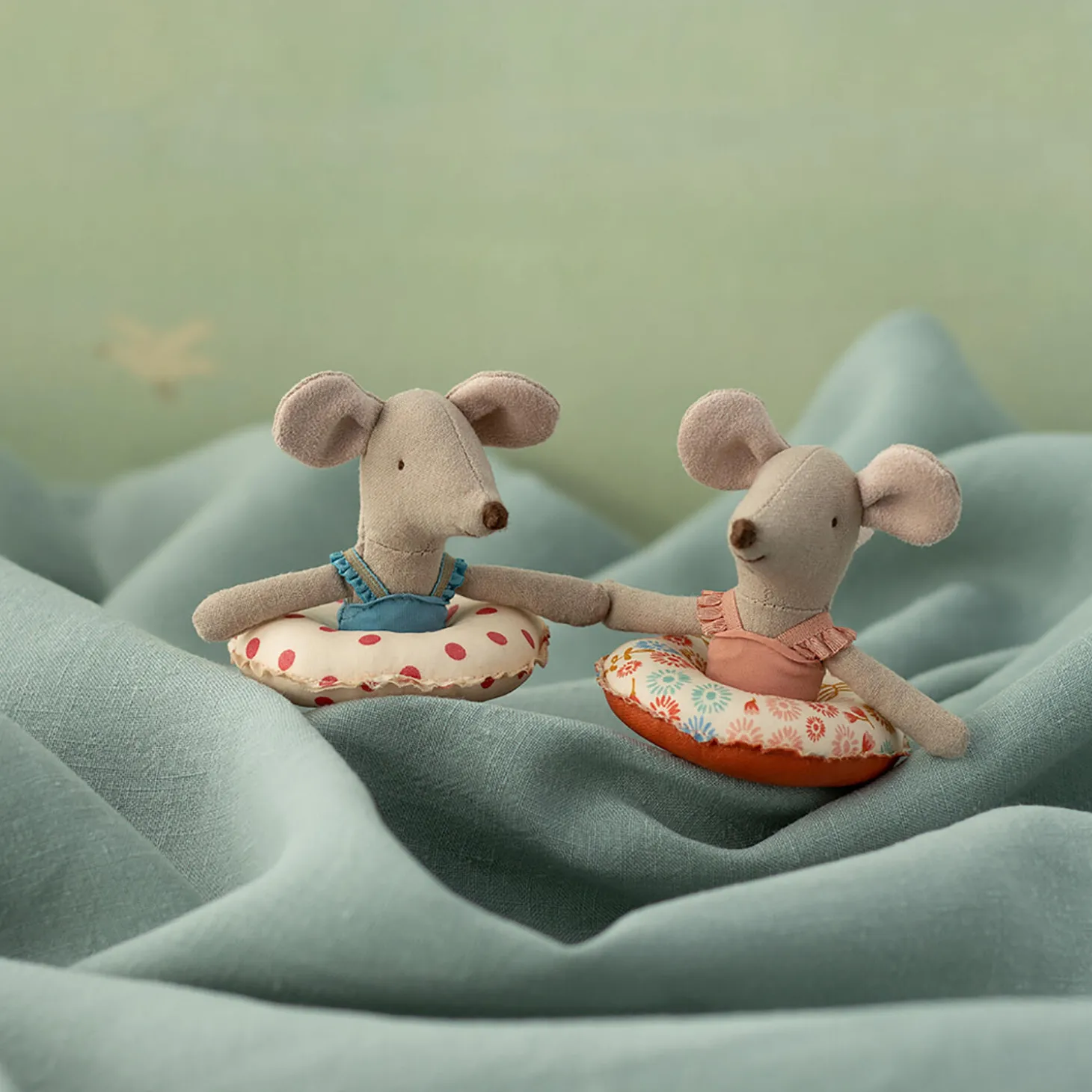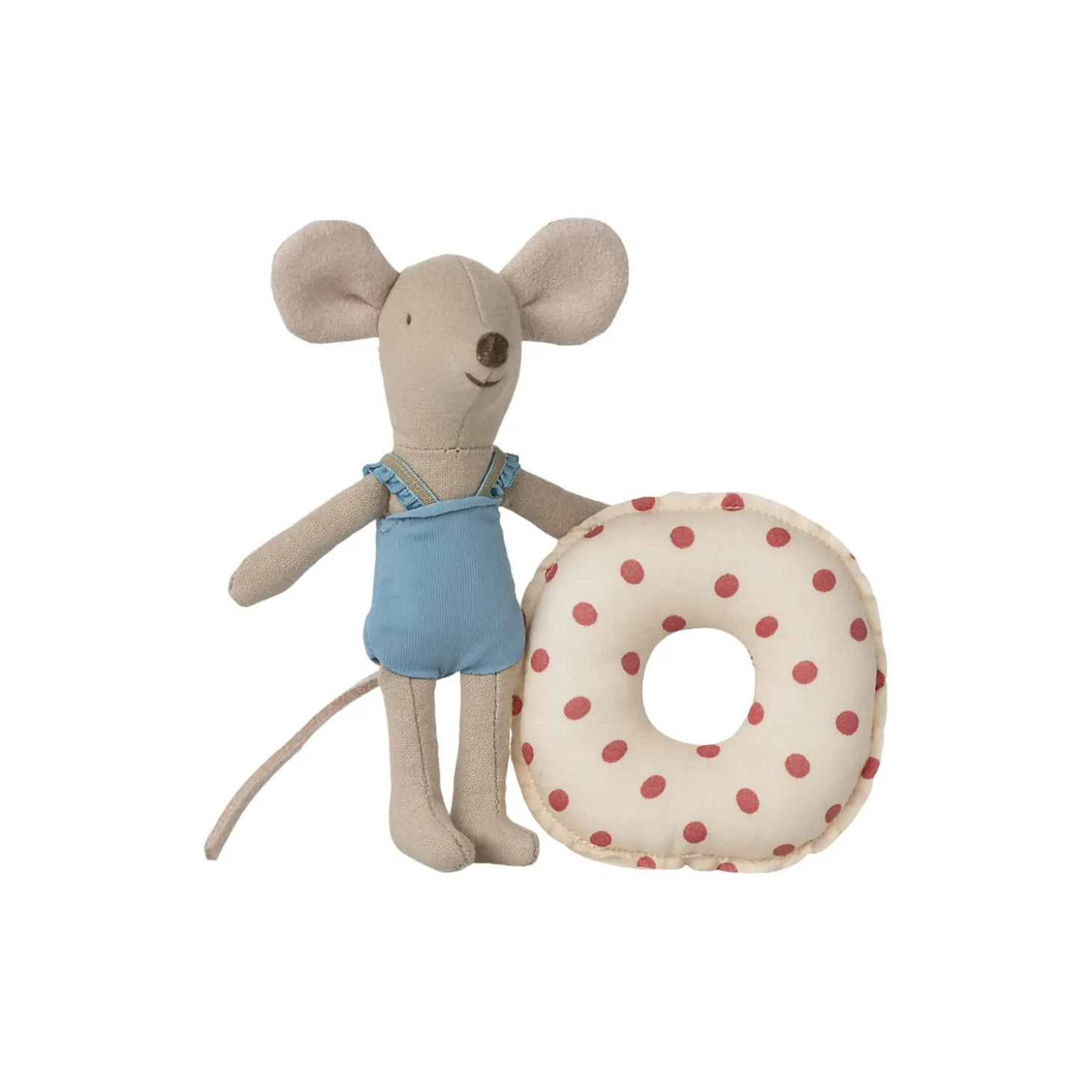 Dette sommersæt består af en lillesøster mus iført en blå badedragt med hendes rødprikkede badering omkring maven. Hun er nu klar til en sikker svømmetur i havet.