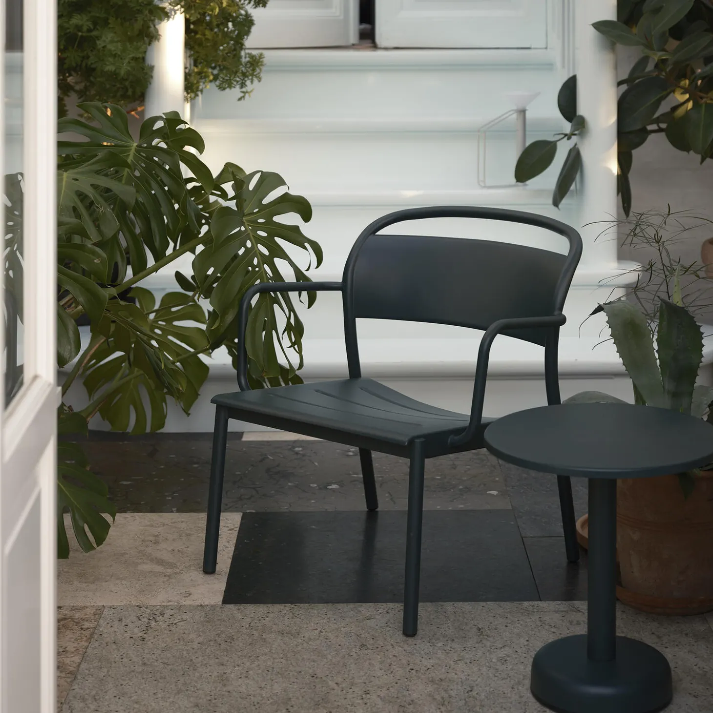 Linear Steel Lounge Armchair from Muuto. The Linear Steel Lounge Armchair is designed with clean, elegant lines and subtle details for a modern expression. Uniting invitingly organic shapes with extensive comfort and long-lasting qualities, the Linear Steel Lounge Armchair is an outdoor chair without any compromises. It is defined by its contrasts; the clean lines of its seat and front legs in combination with the ergonomic, smoothly curved backrest for an enveloping comfort. The Linear Steel Lounge Armchair is rationally designed in the way in which its seat is part of the apron, making for less material use in the production phase while making for a strong, durable design.