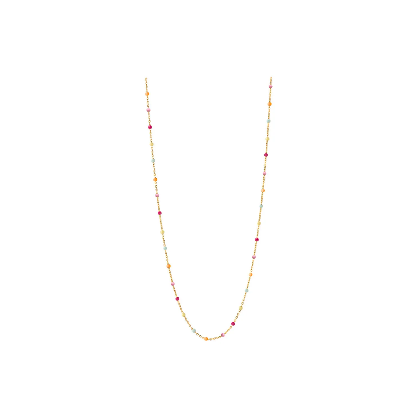 Lola halskæde er en fin kæde med små emaljer. Halskæden giver en fin detalje og kan perfekt kombineres med andre halskæder. Findes i flere farver. Obs: Vær opmærksom på IKKE at bære vores Lola styles i bad, når du sover og for tæt på parfumer og cremer, da emaljen kan ændre farve og struktur.