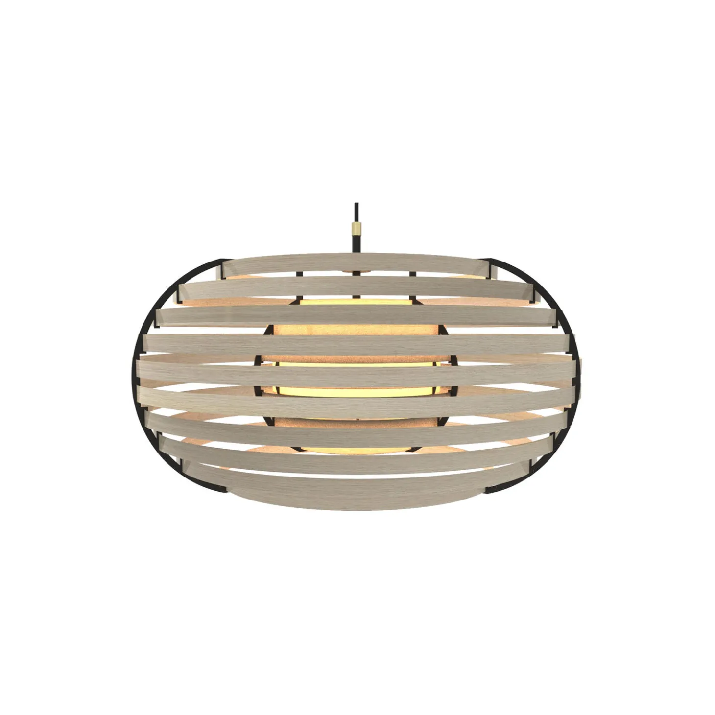 M100 pendel i lakeret ask og sortoxideret stål fra Brian Kirk. Farve: ask. Mål: H: 50 x Ø 100 cm. Lyskilde: maks. 60W E27. Design: Brian Kirk.