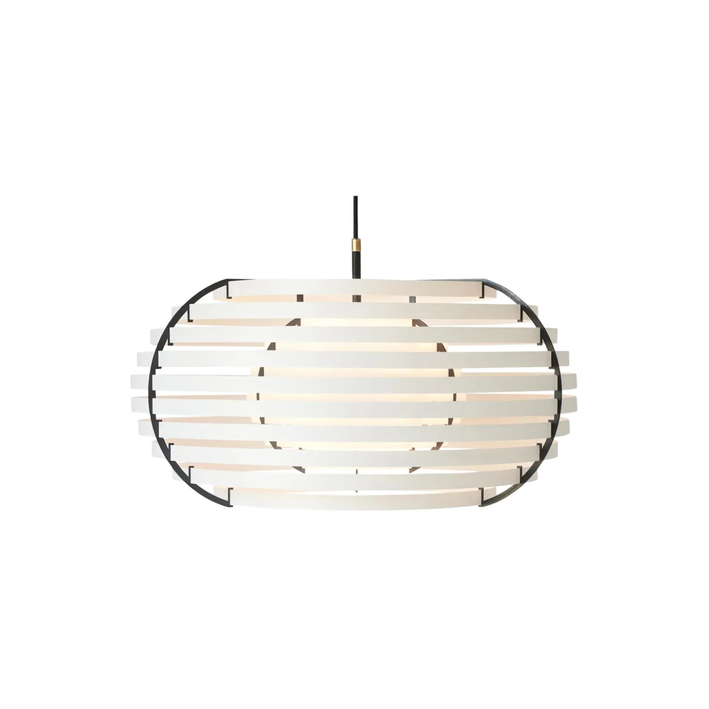 M60 pendel i akryl og sortoxideret stål fra Brian Kirk. Farve: opal. Mål: H: 30 x Ø 60 cm. Lyskilde: maks. 60W E27. Design: Brian Kirk.