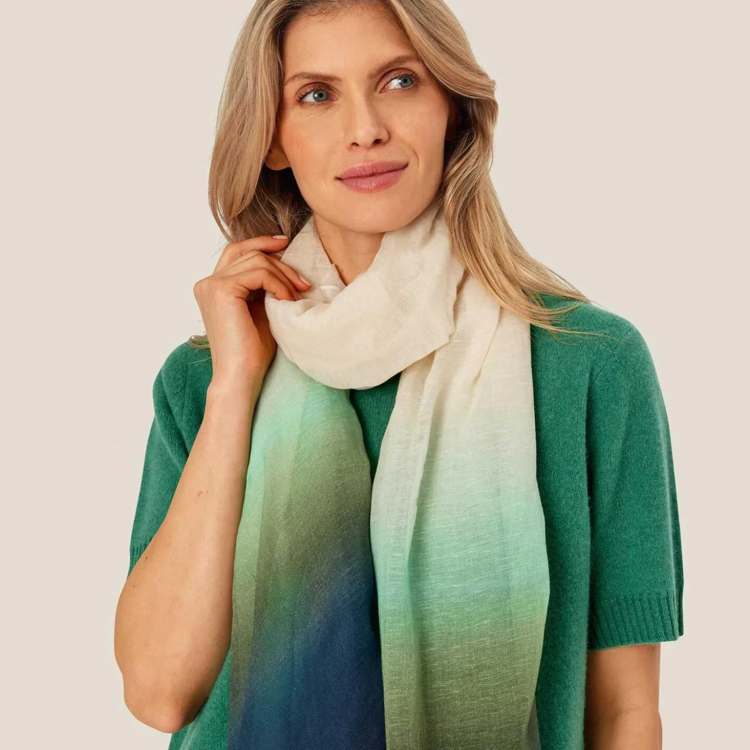 Elegant tørklæde i råhvid med håndmalet print i grønne og blå nuancer i enderne. Brug tørklædet som et stilfuldt pift, og nyd følelsen af det bløde mix af modal, bomuld og hør mod halsen.