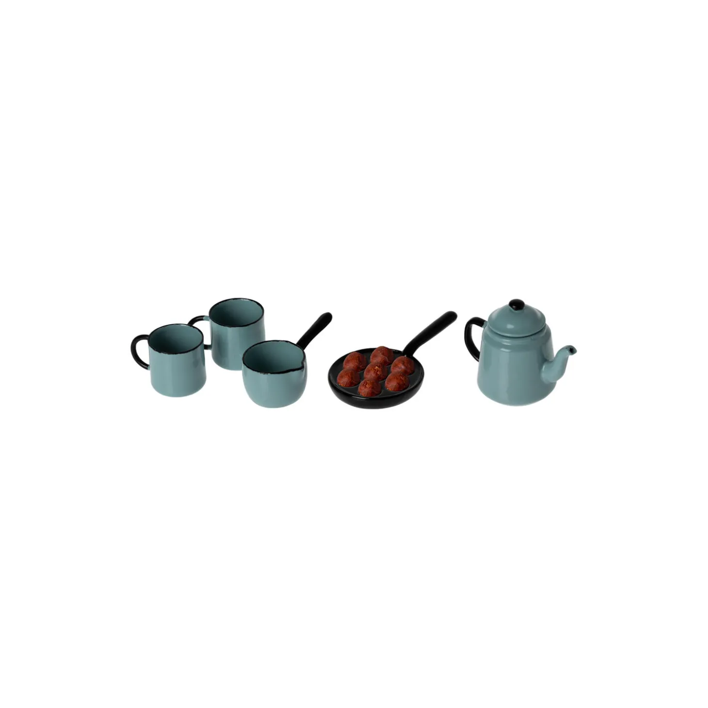 Miniature madlavningssæt med alle Madam Blå’s favoritter. En smuk kande til kaffe, to kopper, en grydeske og en pande med lækre æbleskiver, som er en traditionel skandinavisk godte i den kolde vintertid. Kommer i en papæske designet som et komfur.