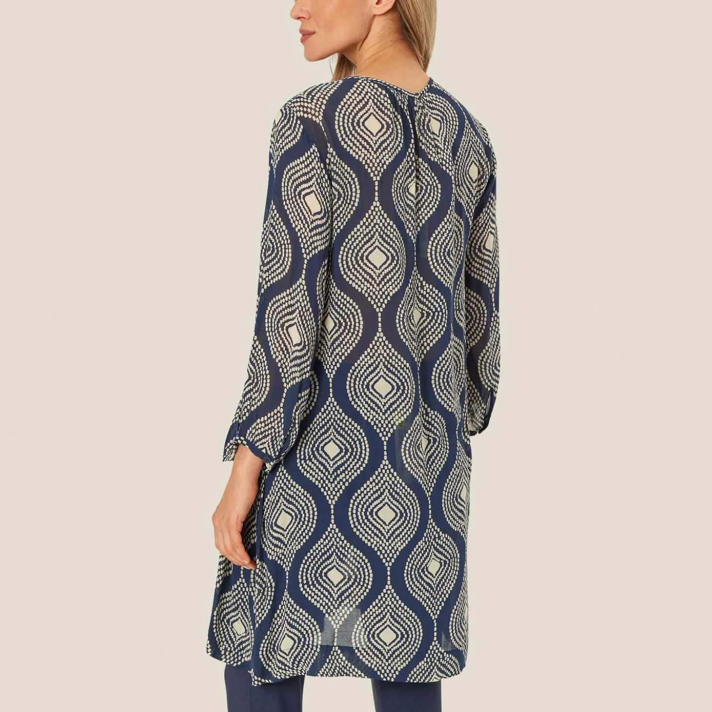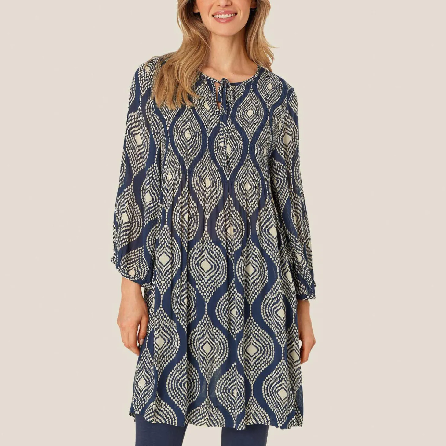 Skab et ubesværet feminint look med denne mønstrede viskosetunika. Den er designet med et flatterende A-formet snit, bindebånd i halsen og en fin detalje på ærmerne, der er skåret på skrå.